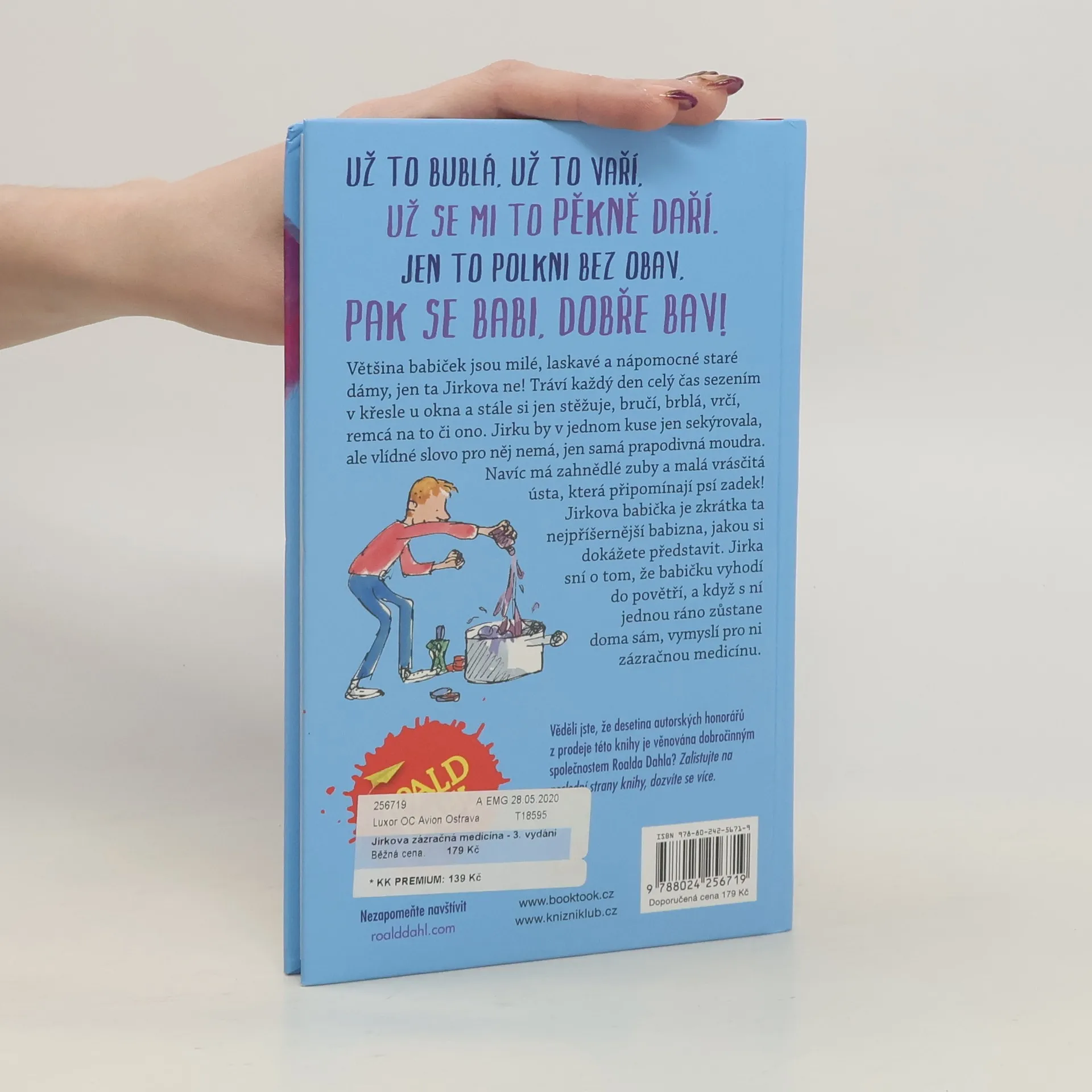 Většina babiček jsou milé, laskavé a nápomocné staré dámy, jen ta Jirkova ne! Tráví každý den celý čas sezením v křesle u okna a stále si jen stěžuje, bručí, brblá, vrčí, remcá na to či ono. Jirku by v jednom kuse jen sekýrovala, ale vlídné slovo pro něj nemá, jen samá prapodivná moudra. Navíc má zahnědlé zuby a malá vrásčitá ústa, která připomínají psí zadek! Jirkova babička je zkrátka ta nejpříšernější babizna, jakou si dokážete představit. Jirka sní o tom, že babičku vyhodí do povětří, a když s ní jednou ráno zůstane doma sám, vymyslí pro ni zázračnou medicínu. Kniha je určena pro děti od 7 let.