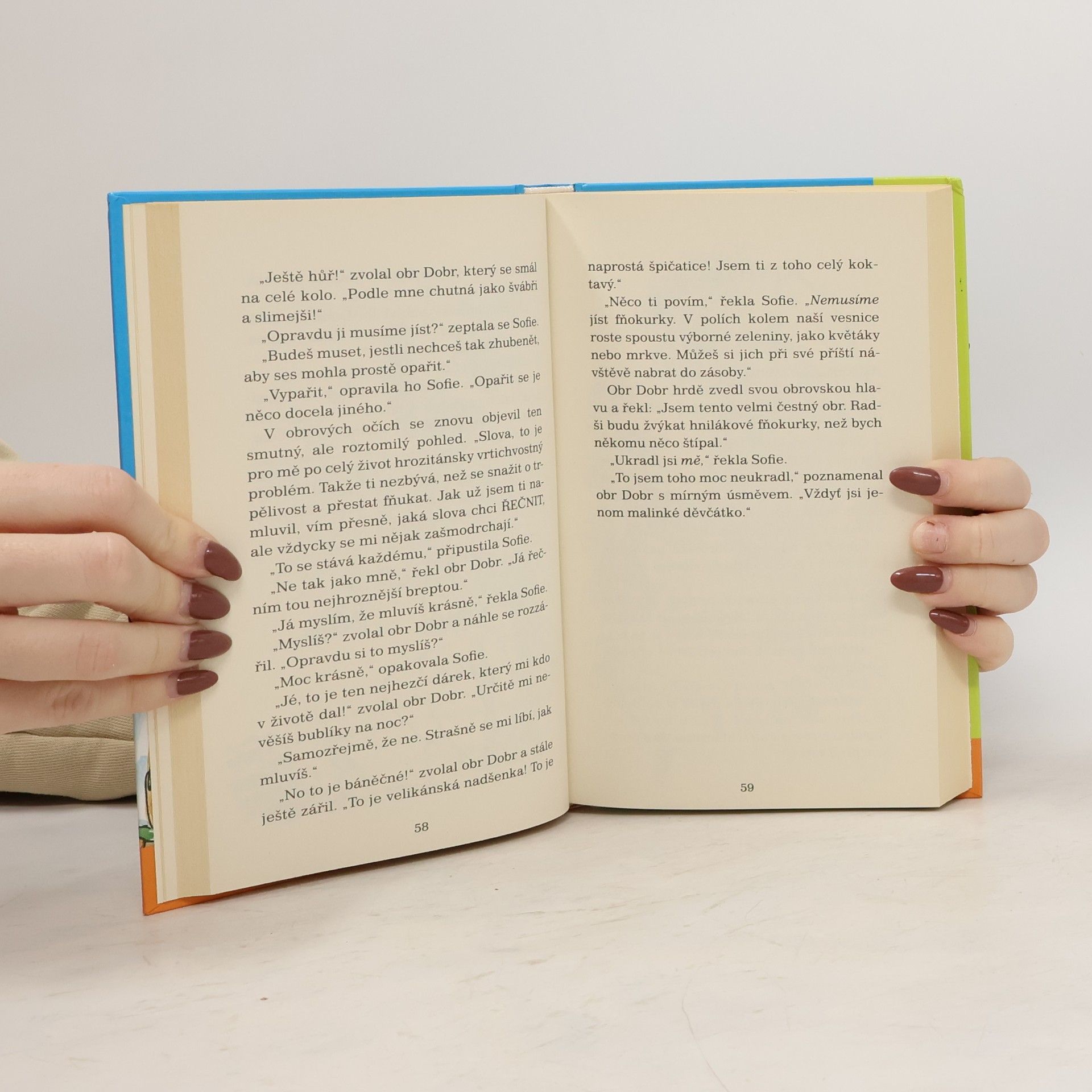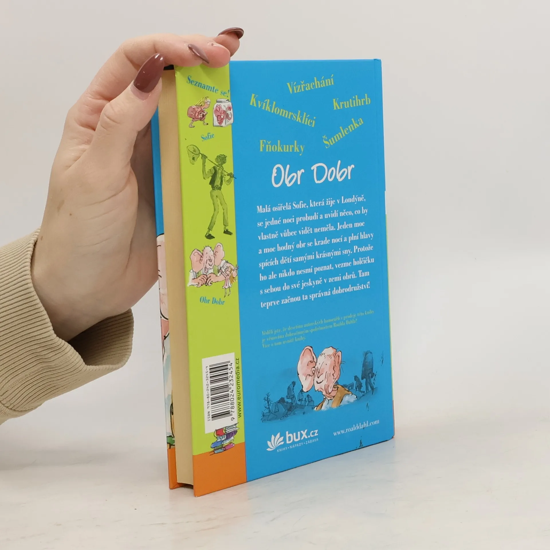Malá osiřelá holčička, která žije v Londýně, se jedné noci probudí a uvidí něco, co by vlastně vůbec vidět neměla. Jeden moc a moc hodný obr se krade nocí a plní hlavy spících dětí samými krásnými sny. Protože ho ale nikdo nesmí poznat, vezme holčičku s sebou do své jeskyně v zemi obrů. Tam teprve začnou ta správná dobrodružství!