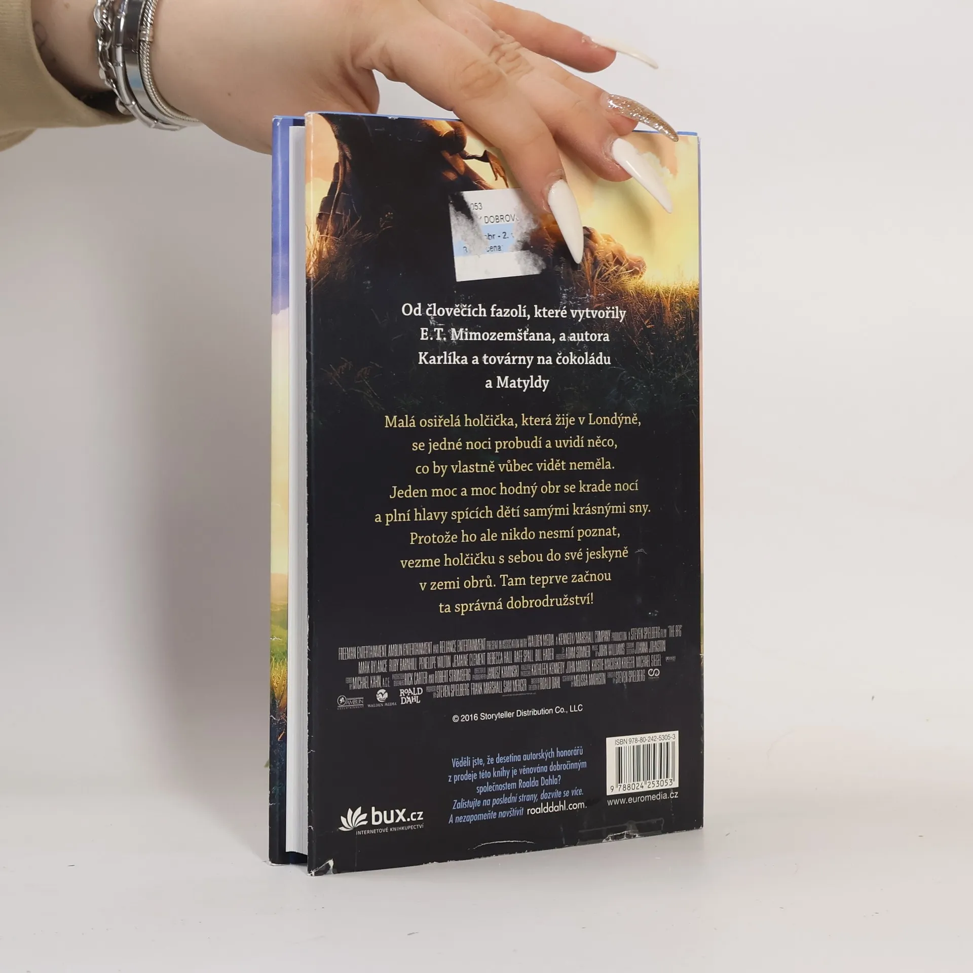 Malá osiřelá holčička, která žije v Londýně, se jedné noci probudí a uvidí něco, co by vlastně vůbec vidět neměla. Jeden moc a moc hodný obr se krade nocí a plní hlavy spících dětí samými krásnými sny. Protože ho ale nikdo nesmí poznat, vezme holčičku s sebou do své jeskyně v zemi obrů. Tam teprve začnou ta správná dobrodružství! Knihu zfilmoval Steven Spielberg. Stejnojmenný film přijde do českých kin 30.6.2016.