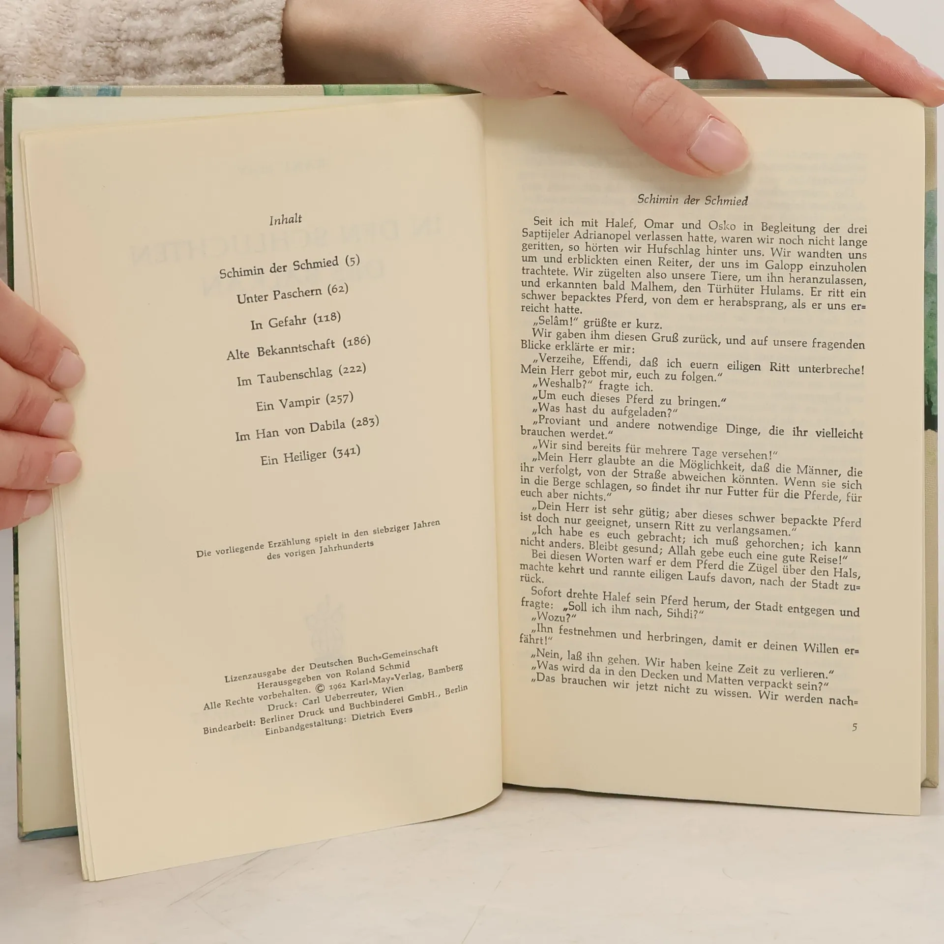 Von Edirne aus reitet Kara Ben Nemsi mit Halef, Osko und Omar Ben Sadek neuen Gefahren entgegen. Abenteuer mit Schmugglern und Halefs groteskes Erlebnis in einem Taubenschlag stehen im Mittelpunkt des Geschehens. In Ostromdscha aber treffen die Freunde auf den 'heiligen' Mübarek...