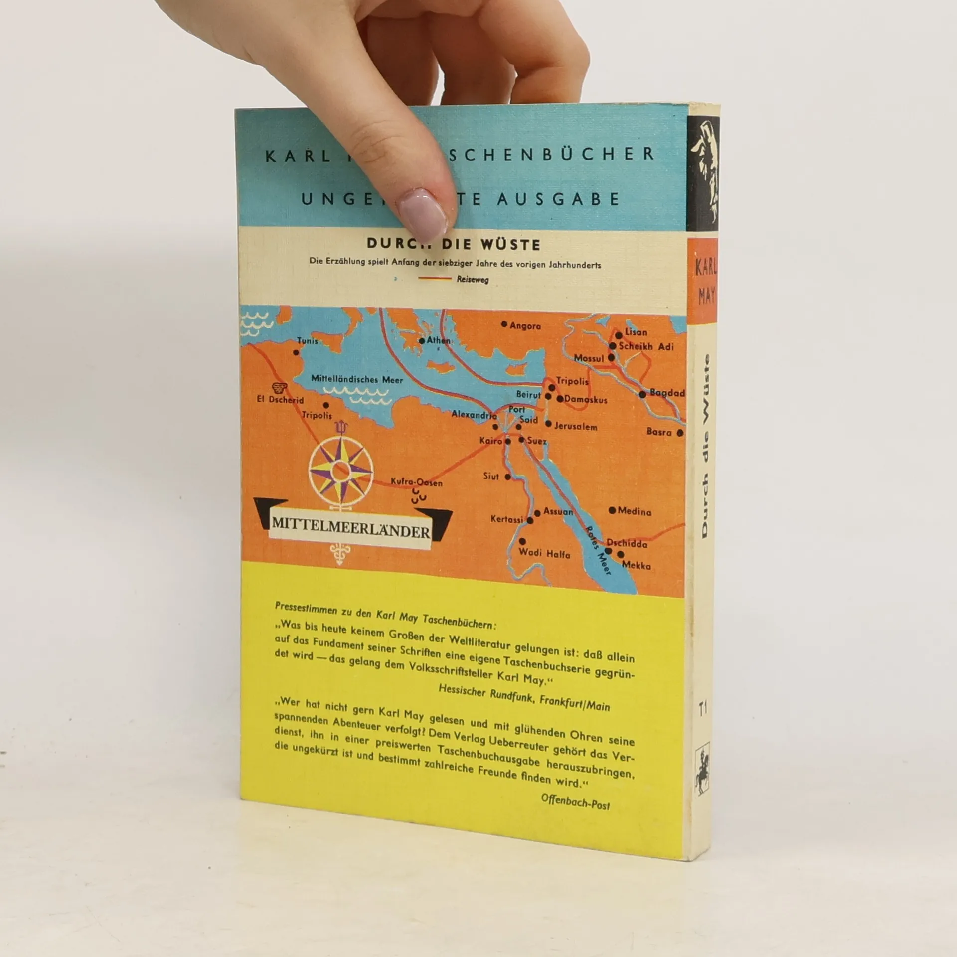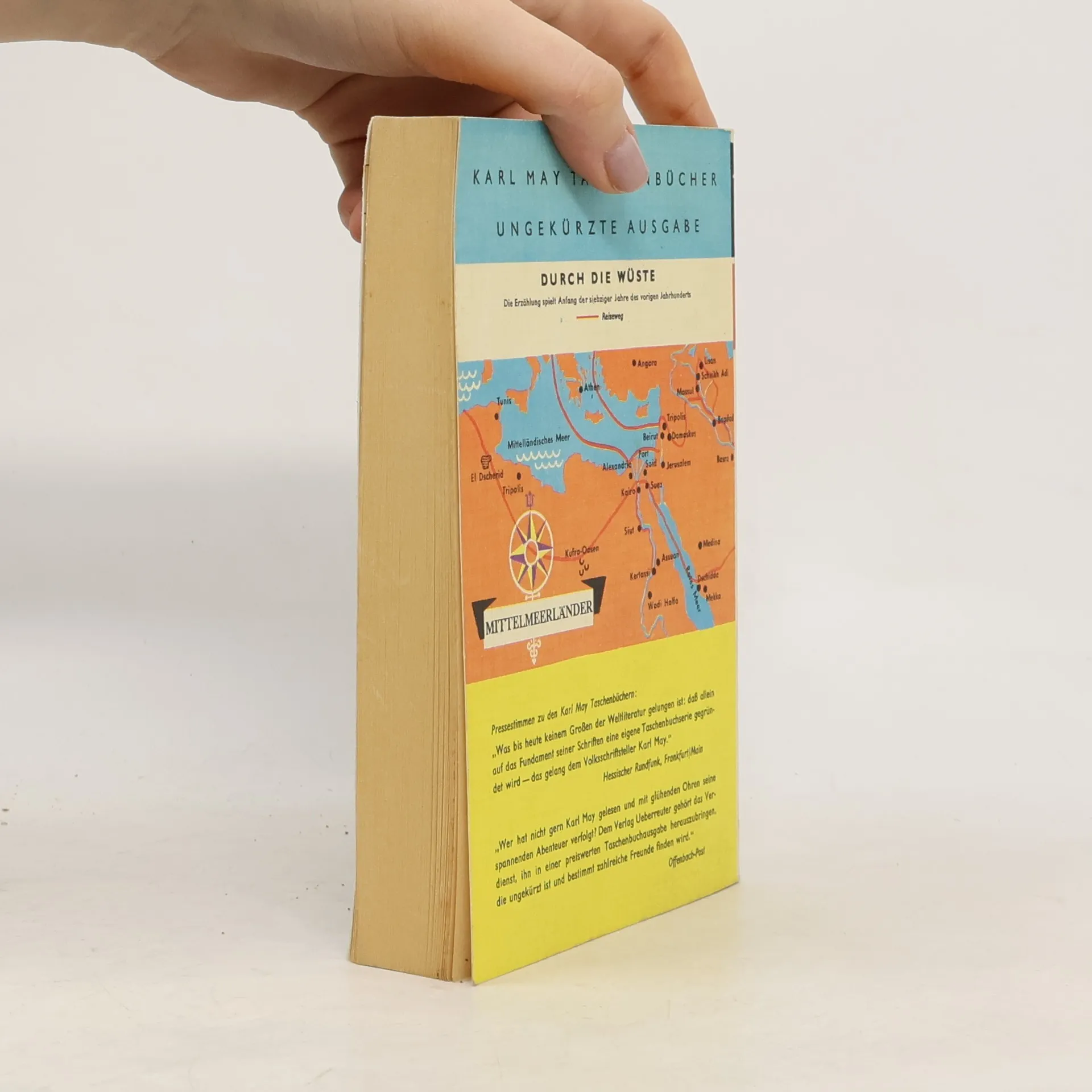 Durch die Wüste reiten Kara Ben Nemsi und Hadschi Halef Omar, sein treuer Gefährte. Der Fund einer Leiche bei den Salzseen Nordafrikas löst ein faszinierendes Abenteuer aus, dessen Folgen den Leser sechs Bände lang in Atem halten. Schon zu Beginn erschließt sich die ganze Buntheit der orientalischen Welt. Fortsetzungen zu "Durch die Wüste": Durchs wilde Kurdistan (Band 2), Von Bagdad nach Stambul (Band 3), In den Schluchten des Balkan (Band 4), Durch das Land der Skipetaren (Band 5), Der Schut (Band 6). Quelle: Karl-May-Verlag GmbH