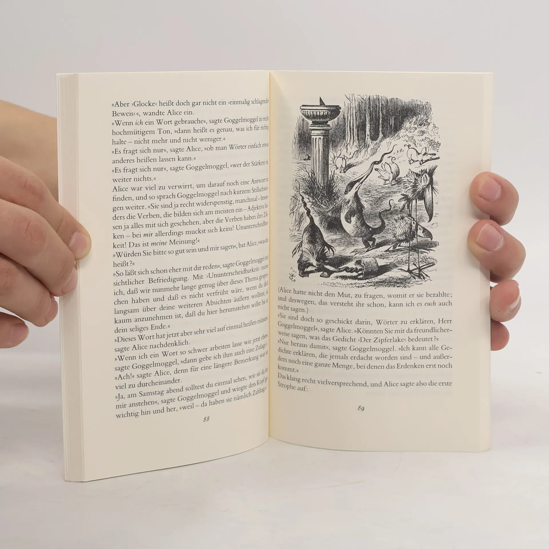 Im Land hinter dem Spiegel begegnet Alice seltsamen Gestalten: dem Ei Humpty Dumpty, dem strickenden Schaf oder den garstigen Schachköniginnen. Mit ihnen liefert sie sich allerhand Wortgefechte, denn in der Spiegel-Welt sieht man die Dinge mit einer ganz eigenen Logik. – Nach ihrer Rückkehr aus dem Wunderland hat Lewis Carroll seine kleine Alice noch einmal in eine Phantasiewelt voller Abenteuer und verdrehter Komik geschickt. Der Klassiker für Kinder zwischen 8 und 80 ist in dieser Neuübersetzung in seinem ganzen frechen Dialogwitz zu lesen.