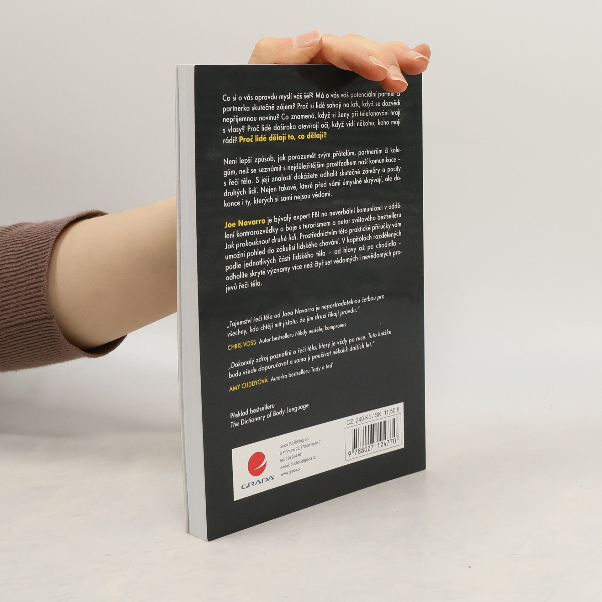 • Co si o vás opravdu myslí váš šéf? • Má o vás váš potenciální partner či partnerka skutečně zájem? • Proč si lidé sahají na krk, když se dozví nepříjemnou novinu? • Co znamená, když si ženy při telefonování hrají s vlasy? • Proč lidé doširoka otevírají oči, když vidí někoho, koho mají rádi? Proč lidé dělají to, co dělají? Není lepší způsob, jak porozumět svým přátelům, partnerům či kolegům, než se seznámit s nejdůležitějším prostředkem naší komunikace – s řečí těla. S její znalostí dokážete odhalit skutečné záměry a pocity druhých lidí. Nejen takové, které před vámi úmyslně skrývají, ale dokonce i ty, kterých si sami nejsou vědomi. Joe Navarro je bývalý expert FBI na neverbální komunikaci v oddělení kontrarozvědky a boje s terorismem a autor světového bestselleru Jak prokouknout druhé lidi. Prostřednictvím této praktické příručky vám umožní pohled do zákulisí lidského chování. V kapitolách rozdělených podle jednotlivých částí lidského těla – od hlavy až po chodidla – odhalíte skryté významy více než čtyř set vědomých i nevědomých projevů řeči těla.