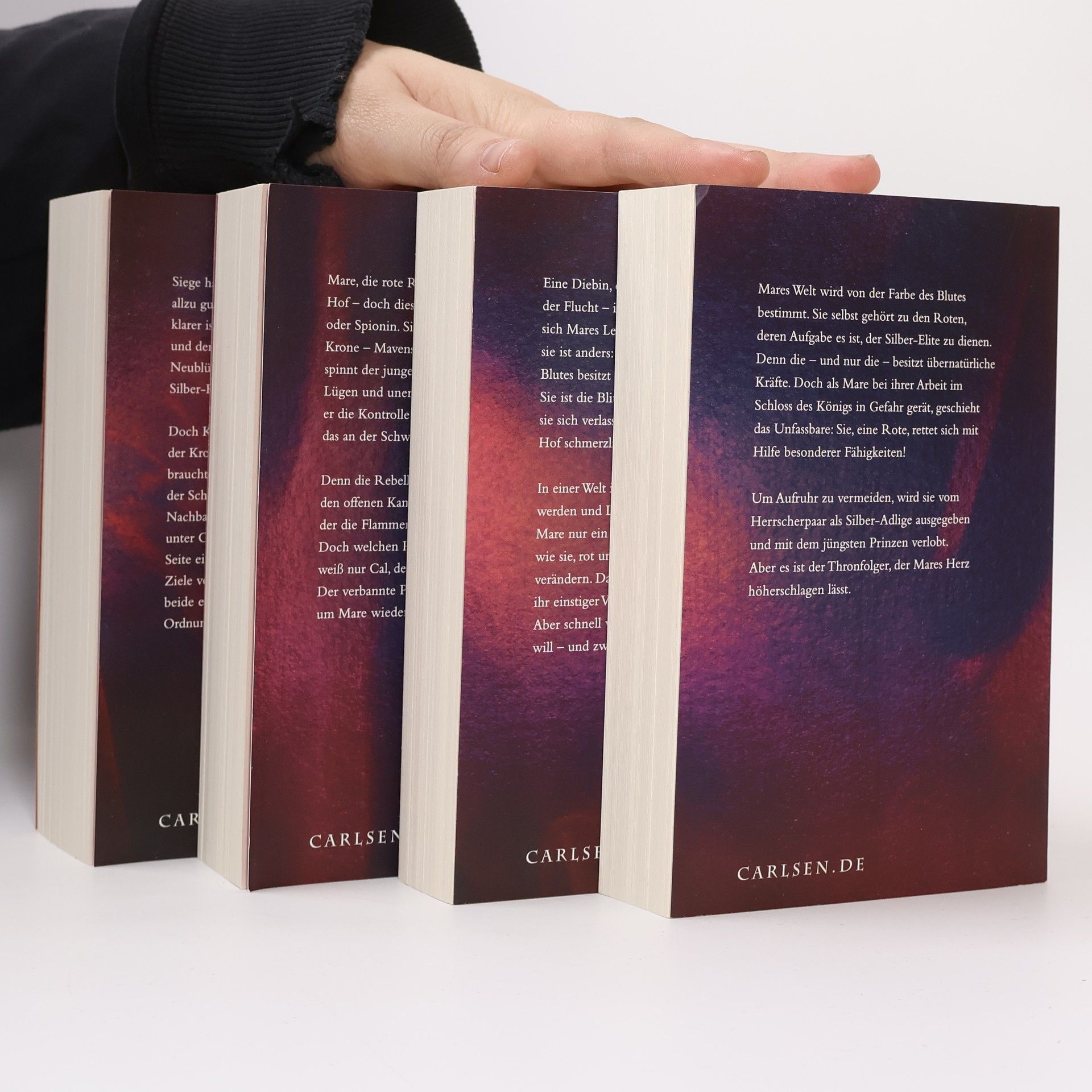 Fesselnd, vielschichtig und voller Leidenschaft – alle 4 Erzählbände der Bestseller-Serie im attraktiven Schuber: ein absolutes Fantasy-Highlight und ein Must-have fürs Bücherregal! Welche Farbe hat dein Blut? Diese Frage bestimmt die Welt, in der Diebin Mare lebt. Denn mit silbernem Blut gehen besondere Fähigkeiten einher und damit die gnadenlose Herrschaft über die niederen Roten. Aber was, wenn man auch als Rote über Kräfte verfügt, so wie Mare? Wenn man ins Visier des Silber-Königs gerät? Und die Aufmerksamkeit der roten Rebellen erregt? Sich in einen Prinzen verliebt, dem man nicht trauen kann? Entscheidungen treffen muss, die Opfer fordern, aber auch die Welt verändern könnten? Für Mare beginnt ein Kampf für ein freies Leben und für die Liebe. Diese Box enthält alle 4 Erzählbände der New-York-Times- und Spiegel-Bestseller-Serie DIE FARBEN DES BLUTES: Band 1: Die rote Königin Band 2: Gläsernes Schwert Band 3: Goldener Käfig Band 4: Wütender Sturm