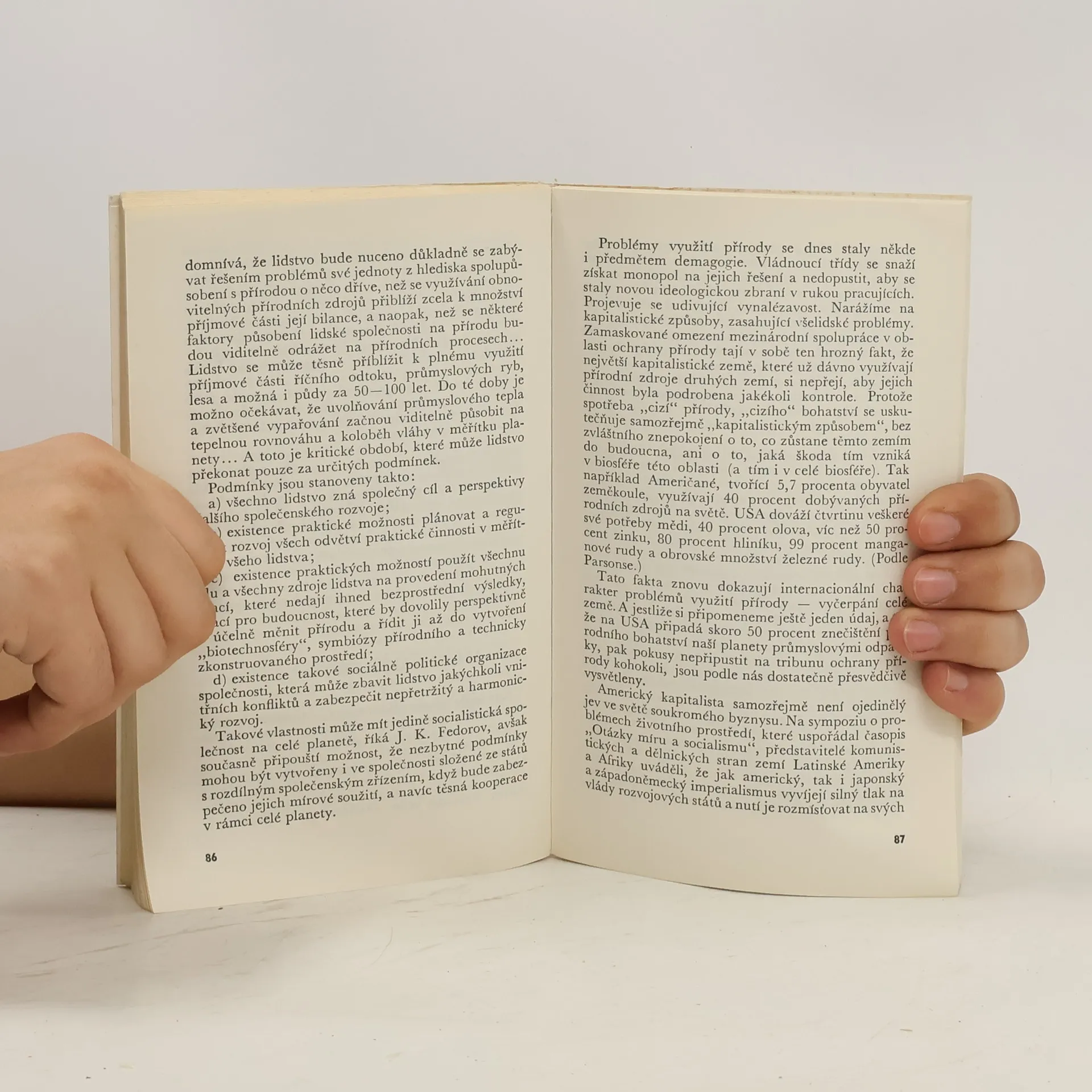 Kniha se zabývá problémem vztahu společnosti k přírodě jako globálním a trvalým problémem, a to nejen technickým, ale v současnosti především sociálním. Sleduje historii tohoto vztahu, jeho současný stav, možný další vývoj, roli vědeckotechnické revoluce, možnosti řízení přírodních procesů, problém výchovy nového vztahu člověka k přírodě. Rozvoj výrobních sil vede k mezníku, za kterým se musí kvalitativně změnit využívání přírody. Ekologie se stává objektem pozornosti vědy, ekonomiky i politiky.