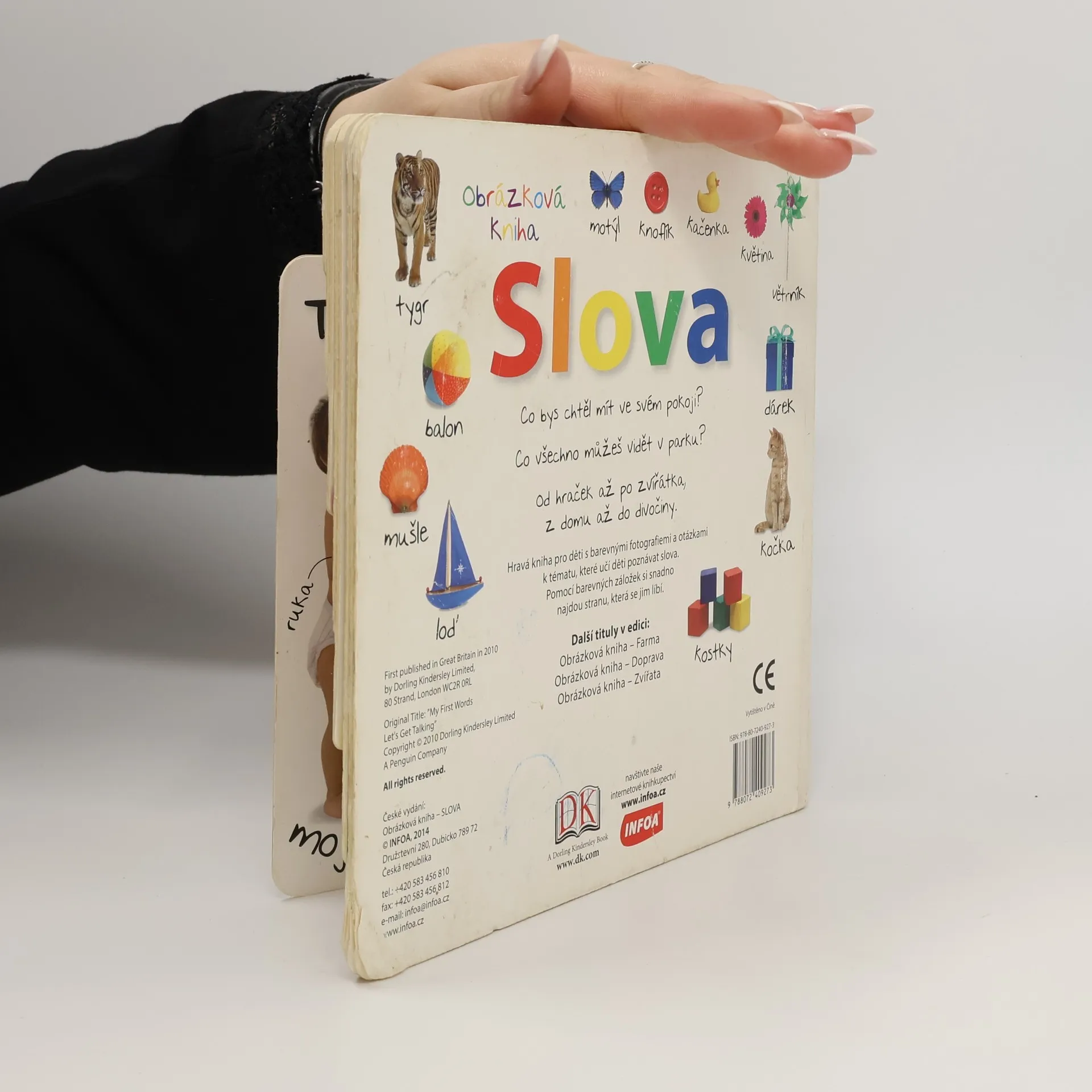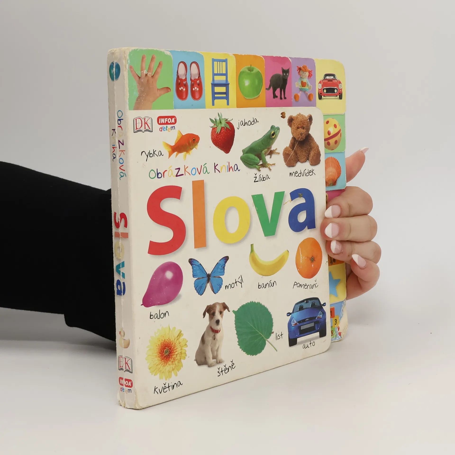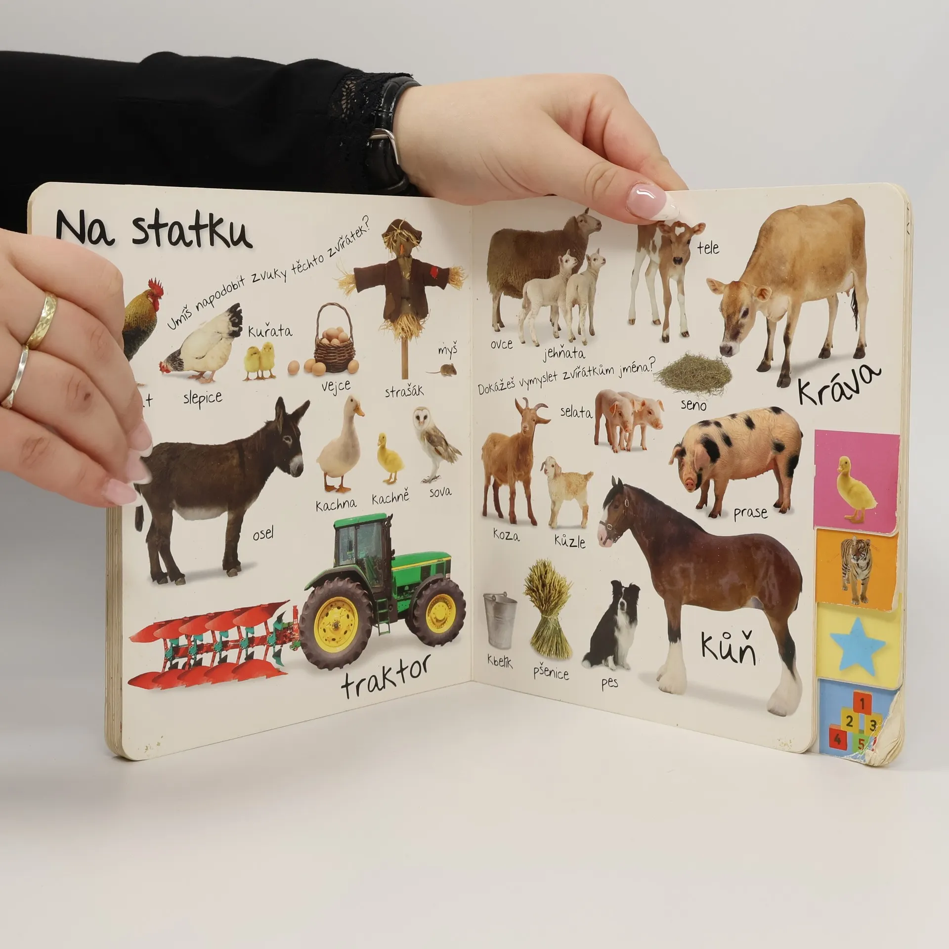 Hravá kniha pro děti s barevnými fotografiemi a otázkami k tématu, které učí děti poznávat slova. Pomocí barevných záložek si snadno najdou stranu, která se jim líbí.
