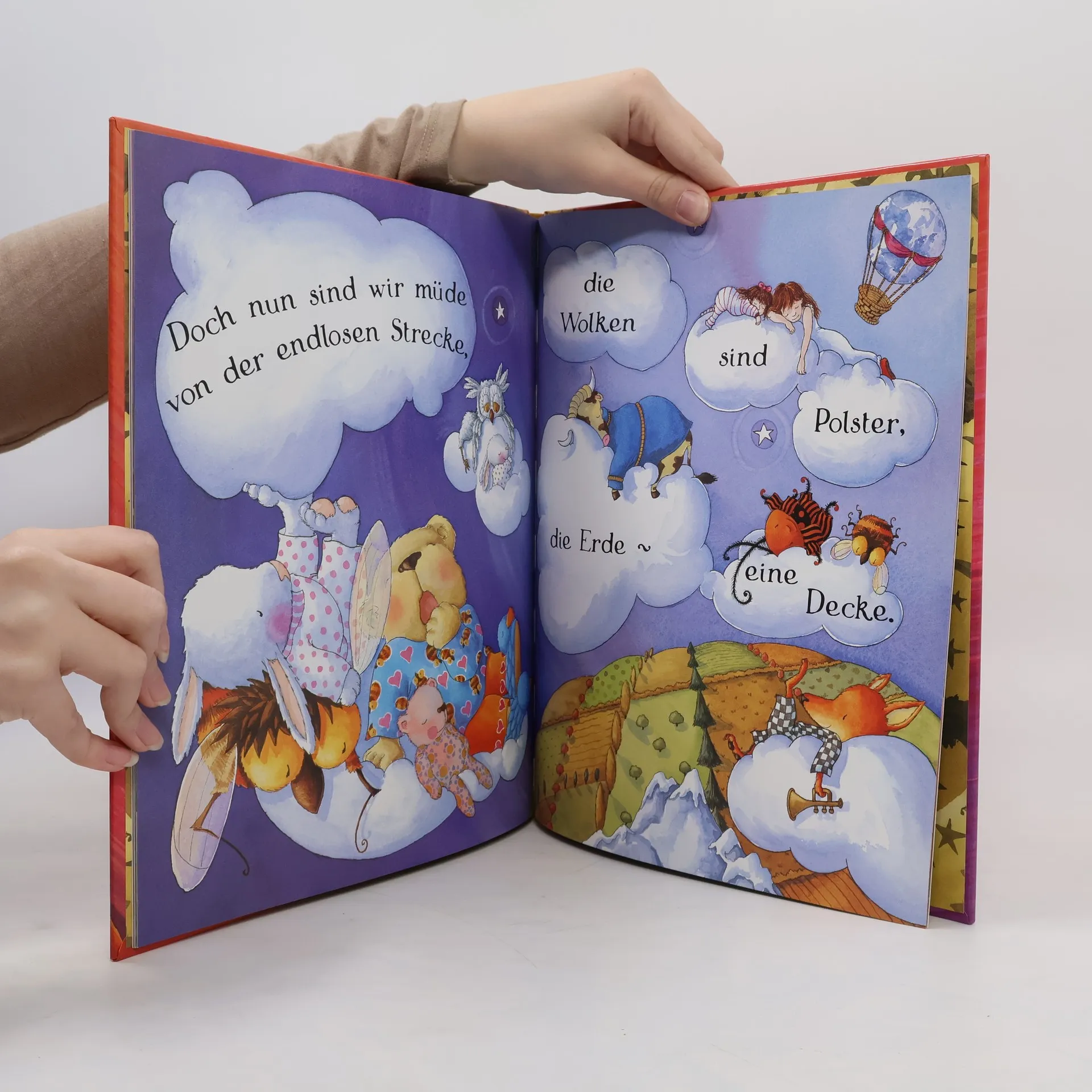Der kleine Bär schwebt ins Reich der Träume, wo er alle schlafenden Kinder trifft und mit ihnen spielt, bis sie müde sind und zurück in ihre Betten segeln.