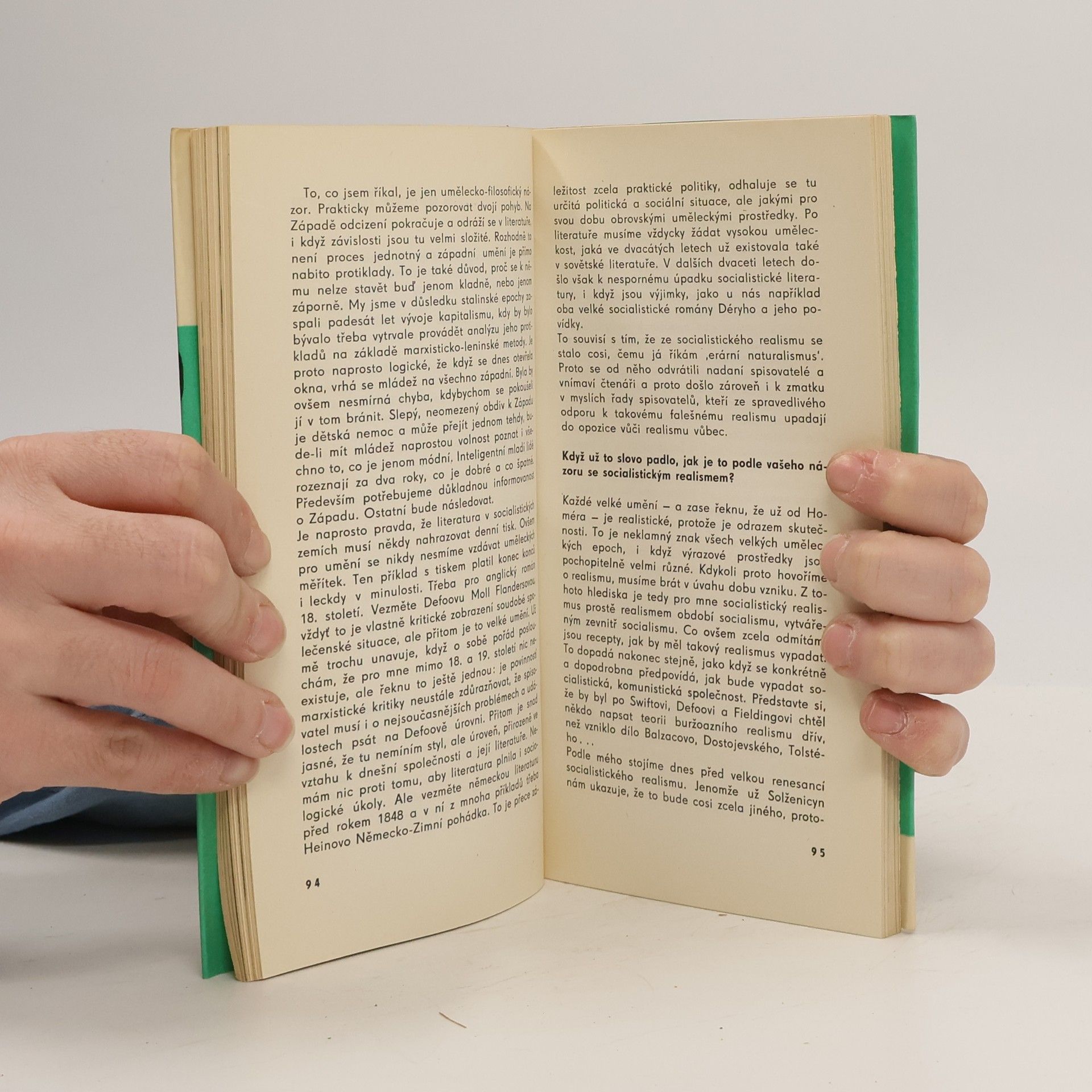 Knížka obsahuje dvanáct, původně v Literárních novinách otištěných rozhovorů s Vercorsem, R. Merlem, E. Trioletovou, L. Aragonem, S. Heymem, Simone de Beauvoir, J.P. Šartrem, G. Lukácsem, P. Brookem, J. Kottem, M. Brodem, E. Fischerem. M. Butorem, R. Guttusem. Spisovatelé, režiséři, teoretikovéliteratury i divadla a vytvarník tu hovoří o otázkách, "jež těsně souvisí s kulturní problematikou našeho času".