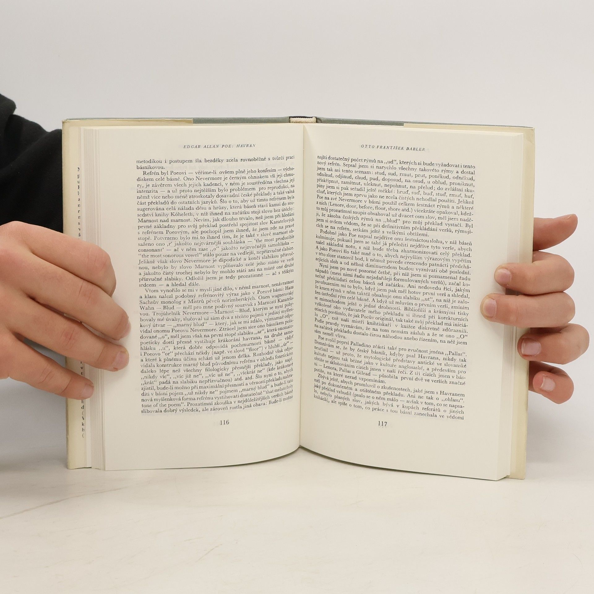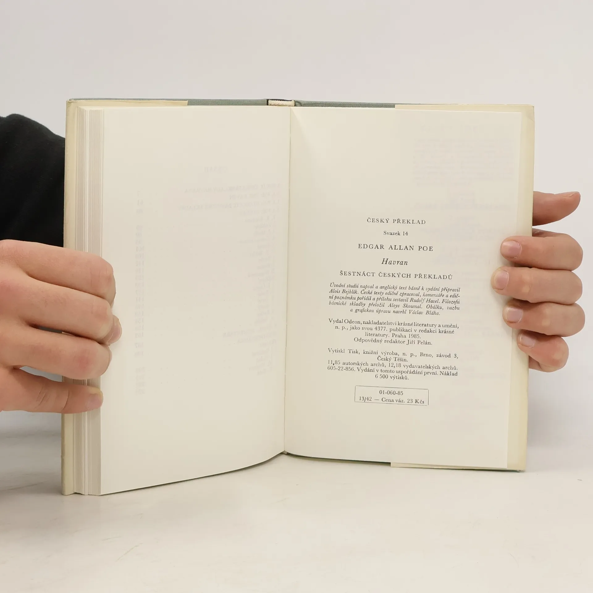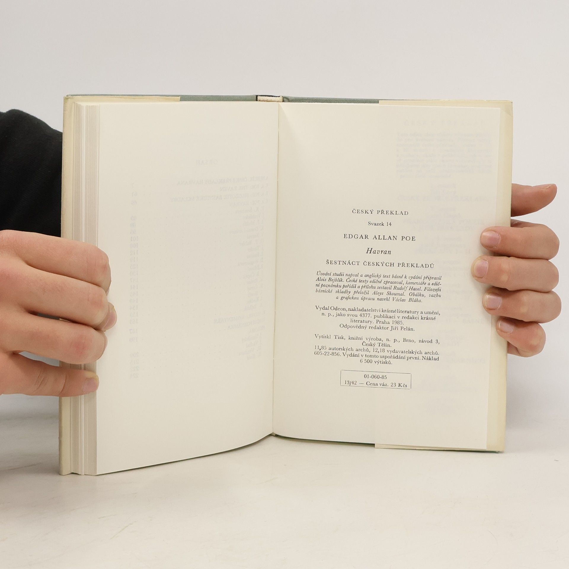 Šestnáct českých překladů Kniha obsahuje úvodní studii A. Bejblíka, originál básně The Raven, Poeovu Filozofii básnické skladby, šestnáct českých překladů Havrana a přílohu s různými parafrázemi Havrana (J. Vrchlický, J. Váchal, V. Vančura, K. Biebl). České texty edičně zpracoval, komentáře a ediční poznámku pořídil a přílohu sestavil Rudolf Havel. Filozofii básnické skladby přeložil Aloys Skoumal. Částečně anglický text. Obsahuje překlady: Vratislav Kazimír Šembera (1869) Jaroslav Vrchlický (1881) Augustin Eugen Mužík (1885) Karel Dostál-Lutinov (1918) Vítězslav Nezval (1928) Otto František Babler (1930) Jiří Taufer (1938) Eugen Stoklas (1939) Dagmar Wagnerová (1945) Rudolf Havel (1946) Jan Blahoslav Čapek (1947) Kamill Resler (1948) Rudolf Černý (1952) Ivan Slavík (1953) Svatopluk Kadlec (1964) Alois Bejblík (1984) Druhé (nezměněné) vydání knihy vyšlo v roce 1990 u téhož nakladatele.