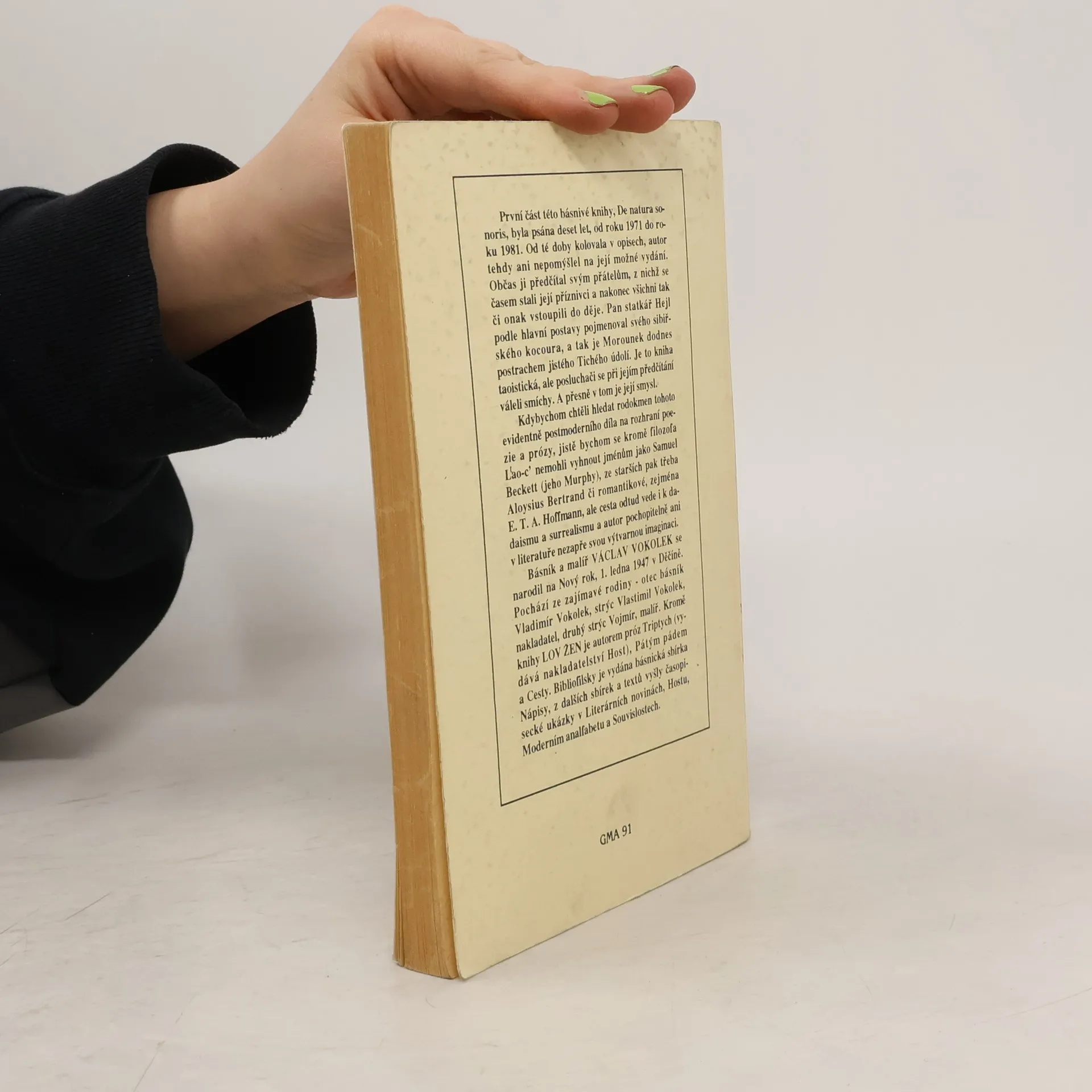 První část této básnivé knihy, De natura sonoris, byla psána deset let, od roku 1971 do roku 1981. Od té doby kolovala v opisech, autor tehdy ani nepomýšlel na její možné vydání. Občas ji předčítal svým přátelům, z nichž se časem stali její příznivci a nakonec všichni tak či onak vstoupili do děje. Pan statkář Hejl podle hlavní postavy pojmenoval svého sibiřského kocoura, a tak je Morounek dodnes postrachem jistého Tichého údolí. Je to kniha taoistická, ale posluchači se při jejím předčítání váleli smíchy. A přesně v tom je její smysl. Kdybychom chtěli hledat rodokmen tohoto evidentně postmoderního díla na rozhraní poezie a prózy, jistě bychom se kromě filozofa L'ao-c’ nemohli vyhnout jménům jako Samuel Beckett (jeho Murphy), ze starších pak třeba Aloysius Bertrand či romantikové, zejména E. T. A. Hoffmann, ale cesta odtud vede i k dadaismu a surrealismu a autor pochopitelně ani v literatuře nezapře svou výtvarnou imaginaci.