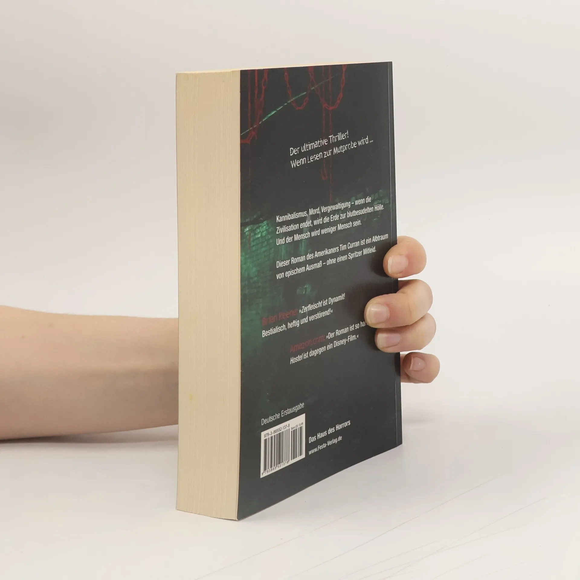 Der ultimative Thriller! Wenn Lesen zur Mutprobe wird. Kannibalismus, Mord, Vergewaltigung – wenn die Zivilisation endet, wird die Erde zur blutbesudelten Hölle. Und der Mensch wird weniger Mensch sein. Dieser Roman des Amerikaners Tim Curran ist ein Albtraum von epischem Ausmaß – ohne einen Spritzer Mitleid. Tim Lebbon: 'Schockierend und brutal.' Brian Keene: 'Zerfleischt ist Dynamit! Bestialisch, heftig und verstörend!' Amazon. com: 'Der Roman ist so hart, Hostel ist dagegen ein Disney-Film.' VIRUS: 'Zerfleischt ist ein beinhartes Splatter-Gemetzel […] ein finsteres, blutiges und kompromissloses Genre-Highlight.' Deutsche Erstausgabe. Broschur 19 x 12 cm, Umschlag in Lederoptik.