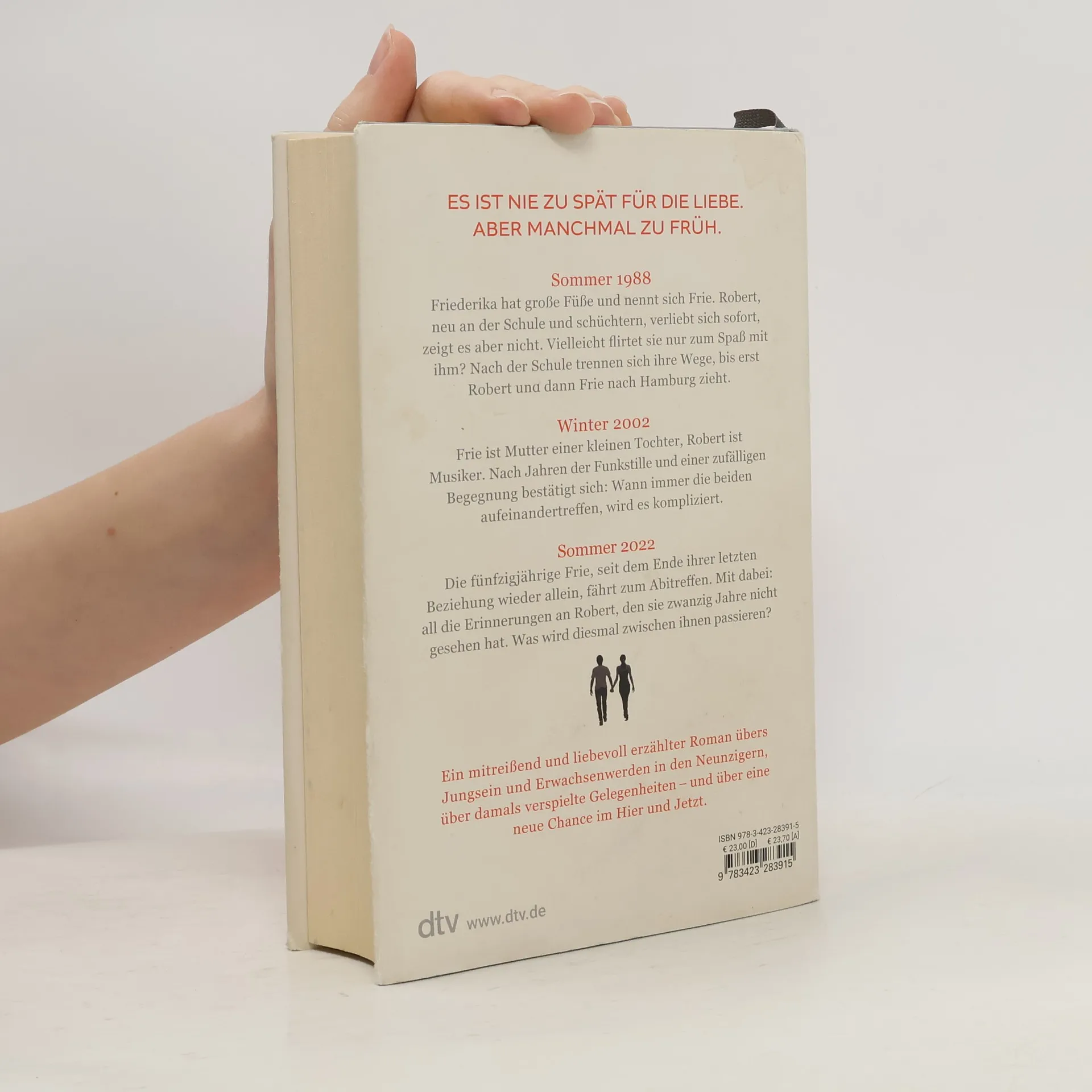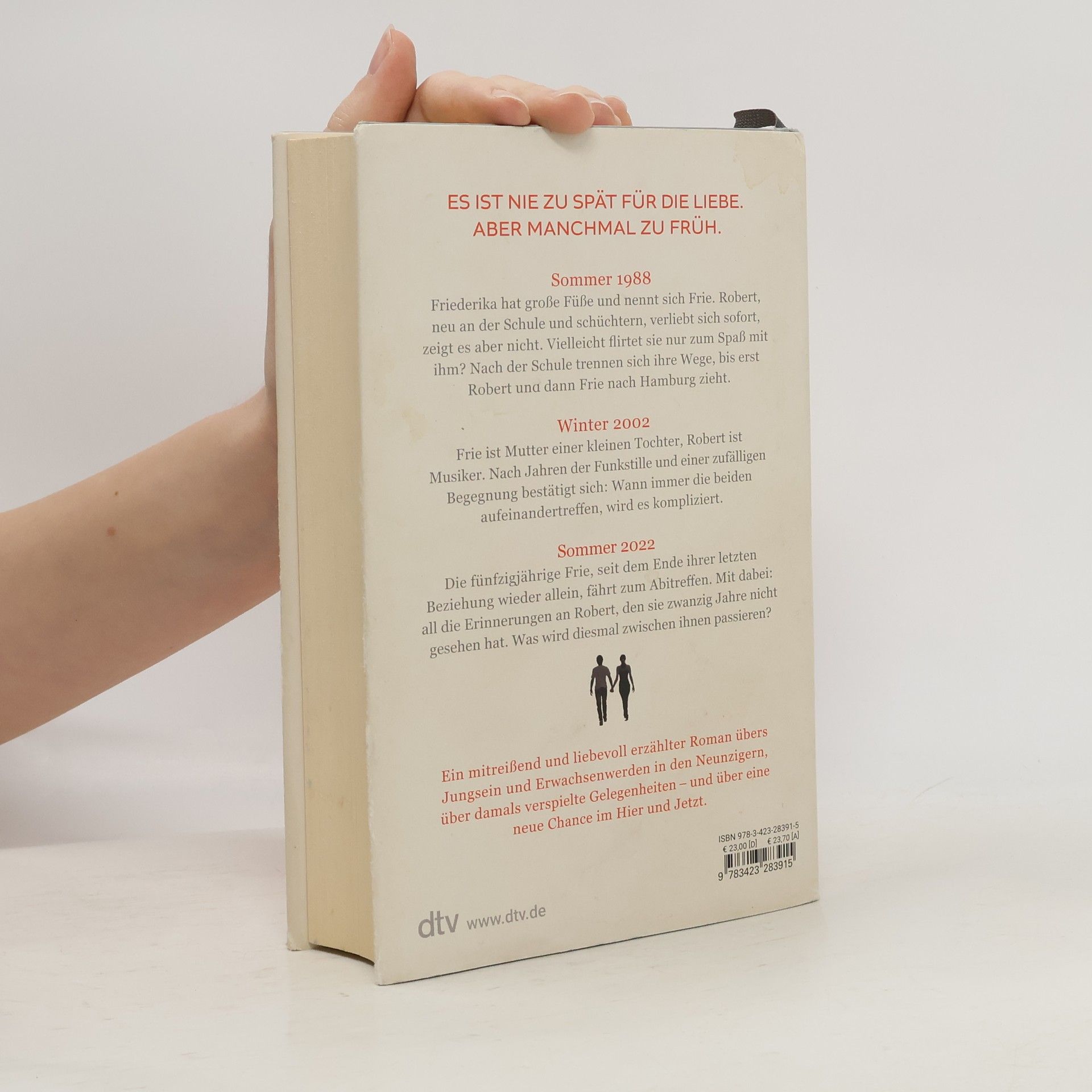 Es ist nie zu spät für die Liebe. Aber manchmal zu früh. Sommer 1988. Friederika hat große Füße und nennt sich Frie. Robert, neu an der Schule und schüchtern, verliebt sich sofort, aber zeigt es nicht. Vielleicht flirtet sie nur zum Spaß mit ihm? Winter 2002. Frie ist Mutter einer kleinen Tochter, Robert ist Musiker. Nach Jahren der Funkstille und einer zufälligen Begegnung bestätigt sich: Wann immer die beiden aufeinandertreffen, wird es kompliziert. Sommer 2022. Frie, inzwischen fünfzig und seit dem Ende ihrer letzten Beziehung wieder Single, fährt zum Abitreffen. Mit dabei: all die Erinnerungen an Robert, den sie seit einer halben Ewigkeit nicht gesehen hat. Was wird diesmal zwischen ihnen passieren? Ein mitreißend und liebevoll erzählter Roman übers Jungsein und Erwachsenwerden in den Neunzigern, über gelebte Träume und verpasste Gelegenheiten – und über eine neue Chance im Hier und Jetzt. Nach ihrem erfolgreichen Debüt ›Am liebsten sitzen alle in der Küche‹ – der neue, eindringliche und sympathisch ehrliche Roman von Julia Karnick. Eine mit Feingefühl und Humor erzählte Geschichte über eine große Liebe und falsche Momente.