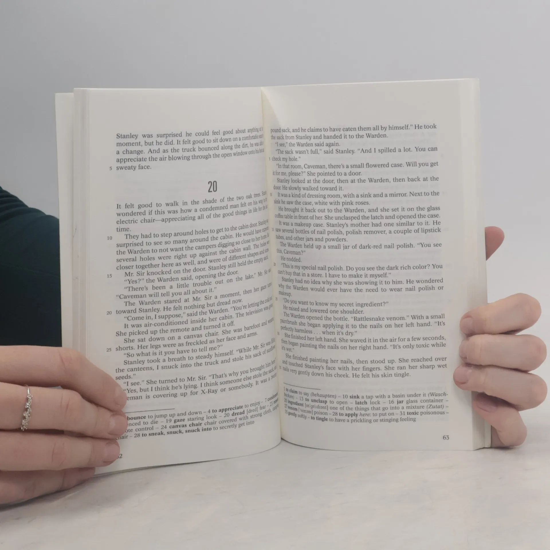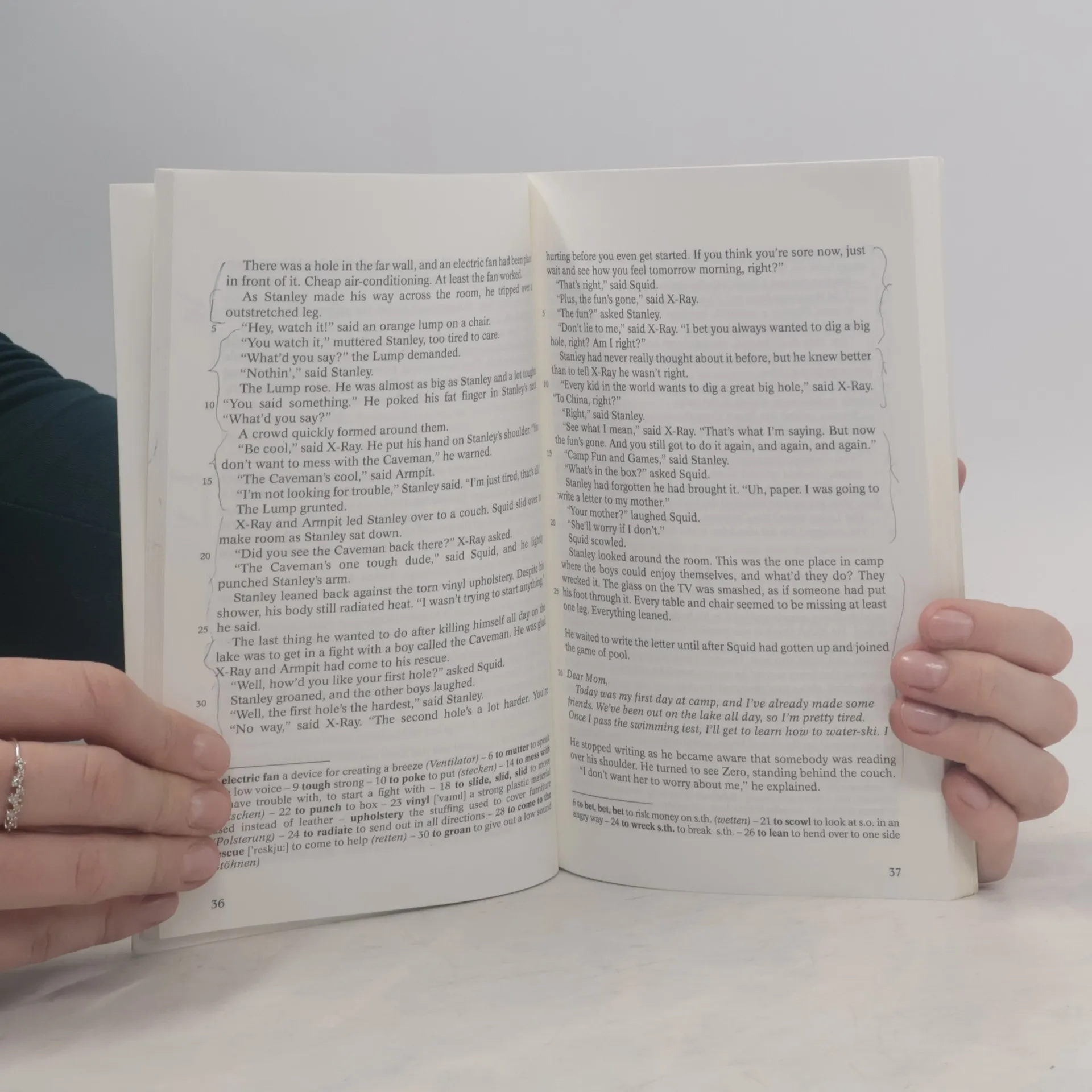 Stanley Yelnats lebt unter einem Fluch, der seit seinem Urgroßvater auf der Familie lastet: er ist zur falschen Zeit am falschen Ort. So ist es auch nicht verwunderlich, dass er in ein Lager für jugendliche Straftäter geschickt wird, obwohl er unschuldig ist. Camp Green Lake heißt das Lager, doch einen See hat es dort seit über 100 Jahren nicht mehr gegeben. Jeden Tag müssen die Jungen ein Loch von 1,50 m Tiefe in den Boden des ehemaligen Sees graben - das soll angeblich Charaktertraining sein. Schon bald merkt Stanley, dass es der Lagerverwalterin nicht um Charaktertraining geht. Eine surrealistische Märchenwelt und harten Realismus vereint der Autor in diesem faszinierenden Werk, in dem auch Freundschaft und menschliche Solidarität ihren Platz haben. Abiturempfehlung zu den Themenbereichen Crime und Growing up