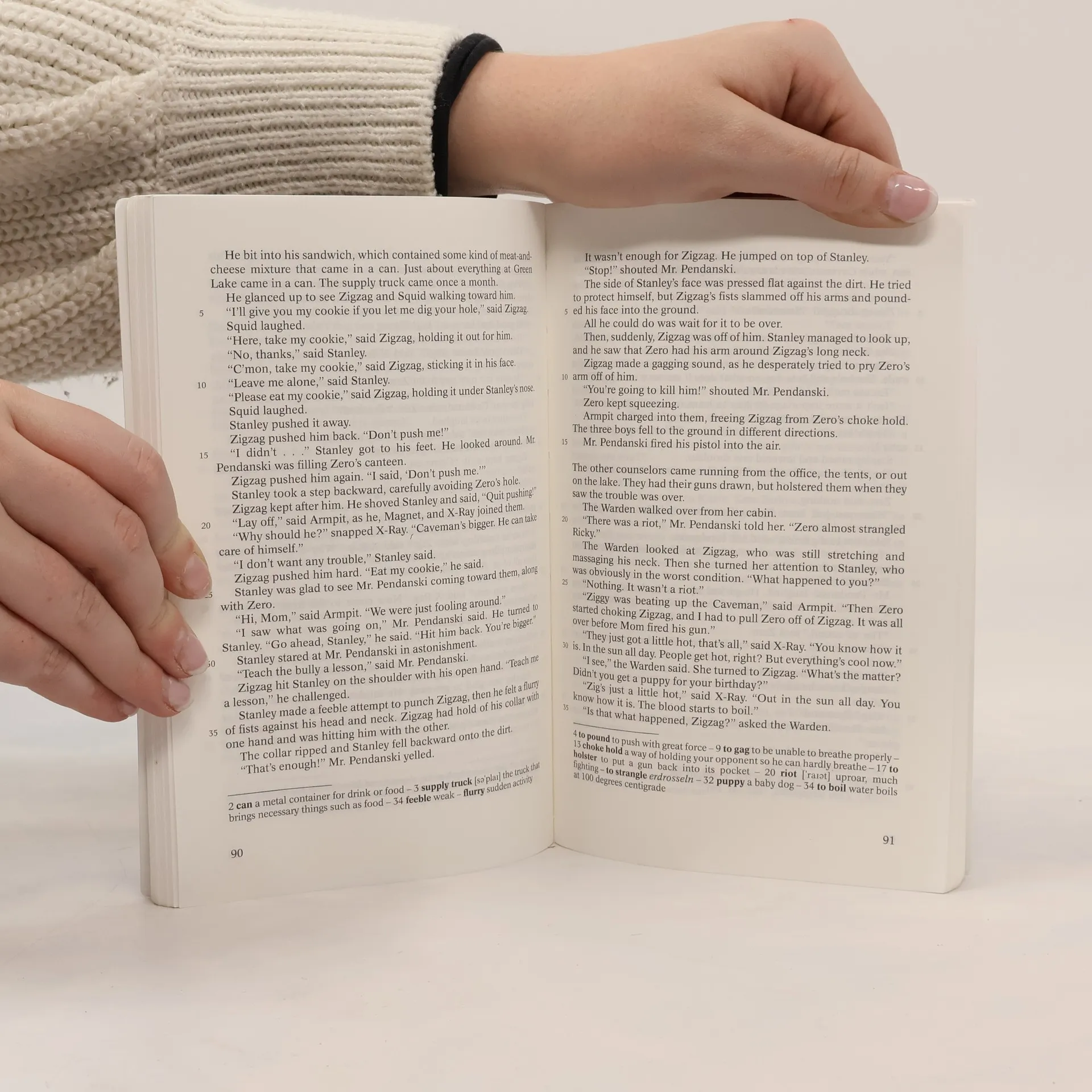 Stanley Yelnats lebt unter einem Fluch, der seit seinem Urgroßvater auf der Familie lastet: er ist zur falschen Zeit am falschen Ort. So ist es auch nicht verwunderlich, dass er in ein Lager für jugendliche Straftäter geschickt wird, obwohl er unschuldig ist. Camp Green Lake heißt das Lager, doch einen See hat es dort seit über 100 Jahren nicht mehr gegeben. Jeden Tag müssen die Jungen ein Loch von 1,50 m Tiefe in den Boden des ehemaligen Sees graben - das soll angeblich Charaktertraining sein. Schon bald merkt Stanley, dass es der Lagerverwalterin nicht um Charaktertraining geht. Eine surrealistische Märchenwelt und harten Realismus vereint der Autor in diesem faszinierenden Werk, in dem auch Freundschaft und menschliche Solidarität ihren Platz haben. Abiturempfehlung zu den Themenbereichen Crime und Growing up