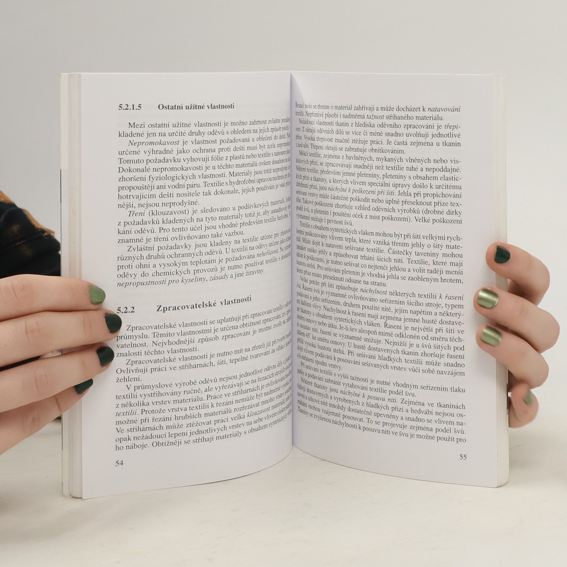 Kniha je druhé, přepracované vydání. Na fotografii zobrazen i první díl. Učebnice pojednává o netkaných, vrstvených a laminátových textiliích. Dále popisuje zušlechťování, oděvní textilie a drobnou přípravu a uvádí rozbory a zkoušení textilií.