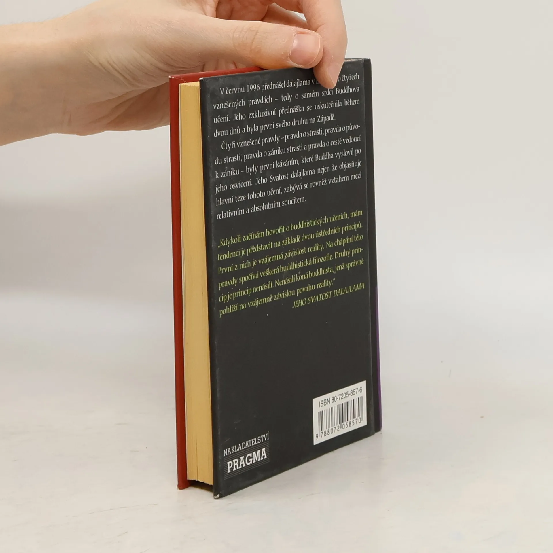 V červnu 1996 přednášel dalajlama v Londýně o čtyřech vznešených pravdách - tedy o samém srdci Buddhova učení. Jeho exkluzivní přednáška se uskutečnila během dvou dnů a byla první svého druhu na Západě. Čtyři vznešené pravdy - pravda o strasti, pravda o původu strasti, pravda o zániku strasti a pravda o cestě vedoucí k zániku - byly první kázáním, které Buddha vyslovil po jeho osvícení. Jeho Svatost dalajlama nejen že objasňuje hlavní teze tohoto učení, zabývá se rovněž vztahem mezi relativním a absolutním soucitem. "Kdykoli začínám hovořit o buddhistických učeních, mám tendenci je představit na základě dvou ústředních principů. První z nich je vzájemná závislost reality. Na chápání této pravdy spočívá veškerá buddhistická filozofie. Druhý princip je princip nenásilí. Nenásilí koná buddhista, jenž správně pohlíží na vzájemně závislou povahu reality." JEHO SVATOST DALAJLAMA