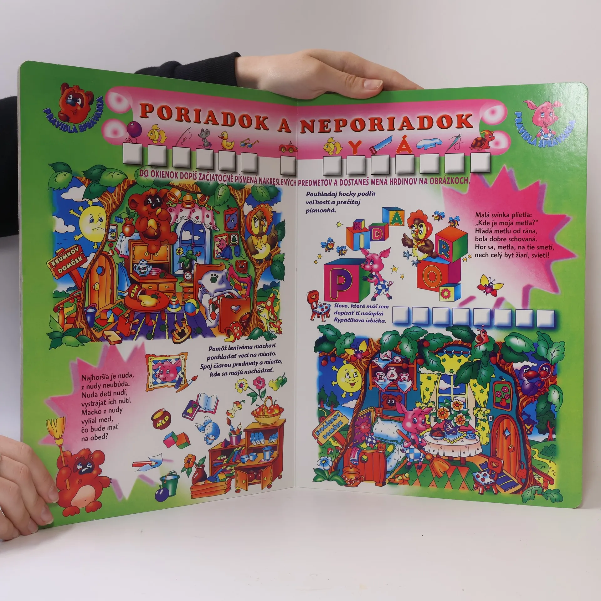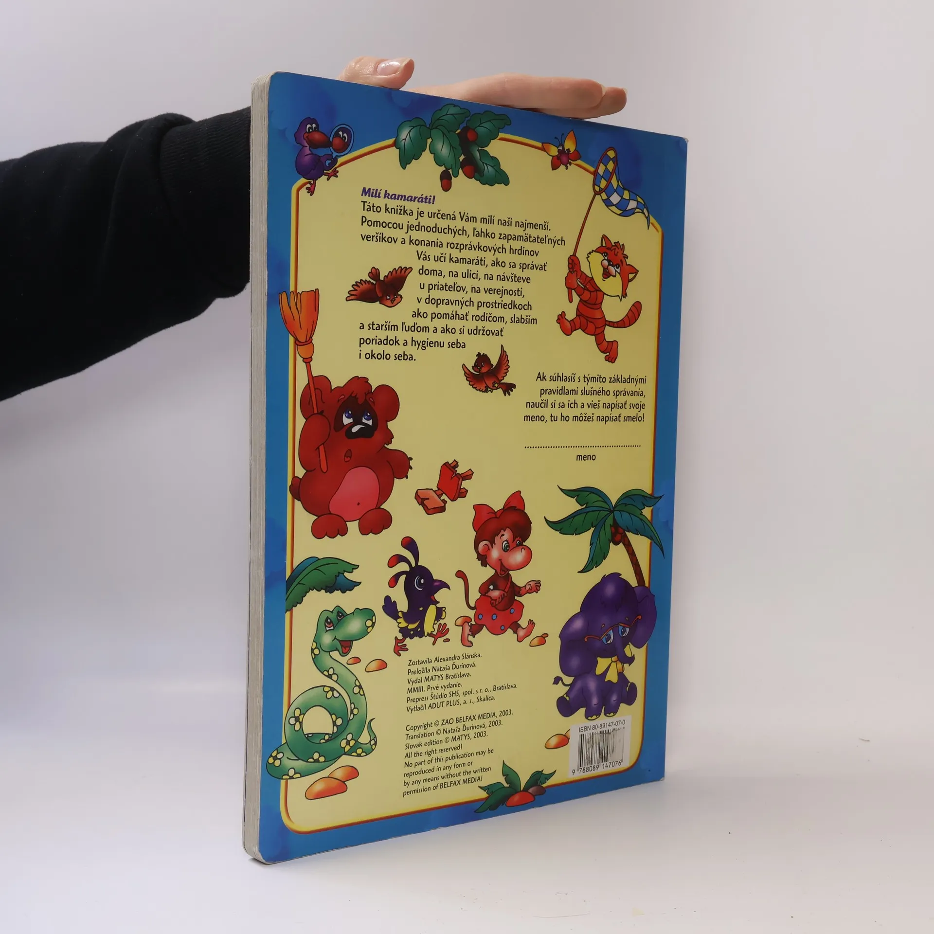Pomocou jednoduchých, ľahko zapamätateľných veršíkov a konania rozprávkových hrdinov sa vaše dieťa učí, ako sa správať doma, na ulici, na návšteve u priateľov, na verejnosti, v dopravných prostriedkoch ako pomáhať rodičom, slabším a starším ľuďom a ako si udržovať poriadok a hygienu seba i okolo seba. schovat popis