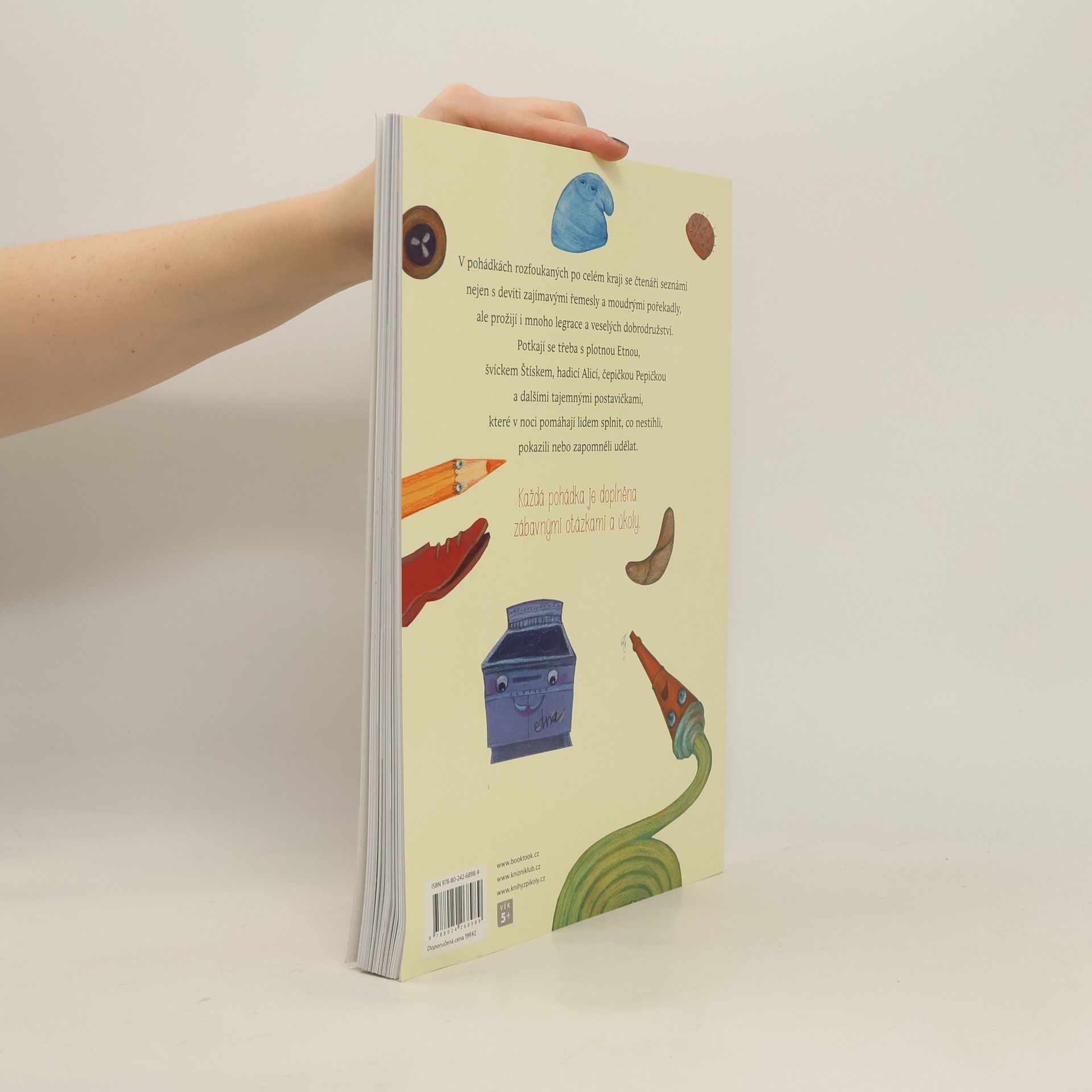 V pohádkách rozfoukaných po celém kraji se čtenáři seznámí nejen s devíti zajímavými řemesly a moudrými pořekadly, ale prožijí i mnoho legrace a veselých dobrodružství. V knížce se čtenáři potkají třeba s plotnou Etnou, švíckem Štískem, hadicí Alicí, čepičkou Pepičkou a dalšími tajemnými postavičkami, které v noci pomáhají lidem splnit, co nestihli, pokazili nebo zapomněli udělat. Každá pohádka je doplněna zábavnými otázkami a úkoly. Nakladatelská anotace. Kráceno.
