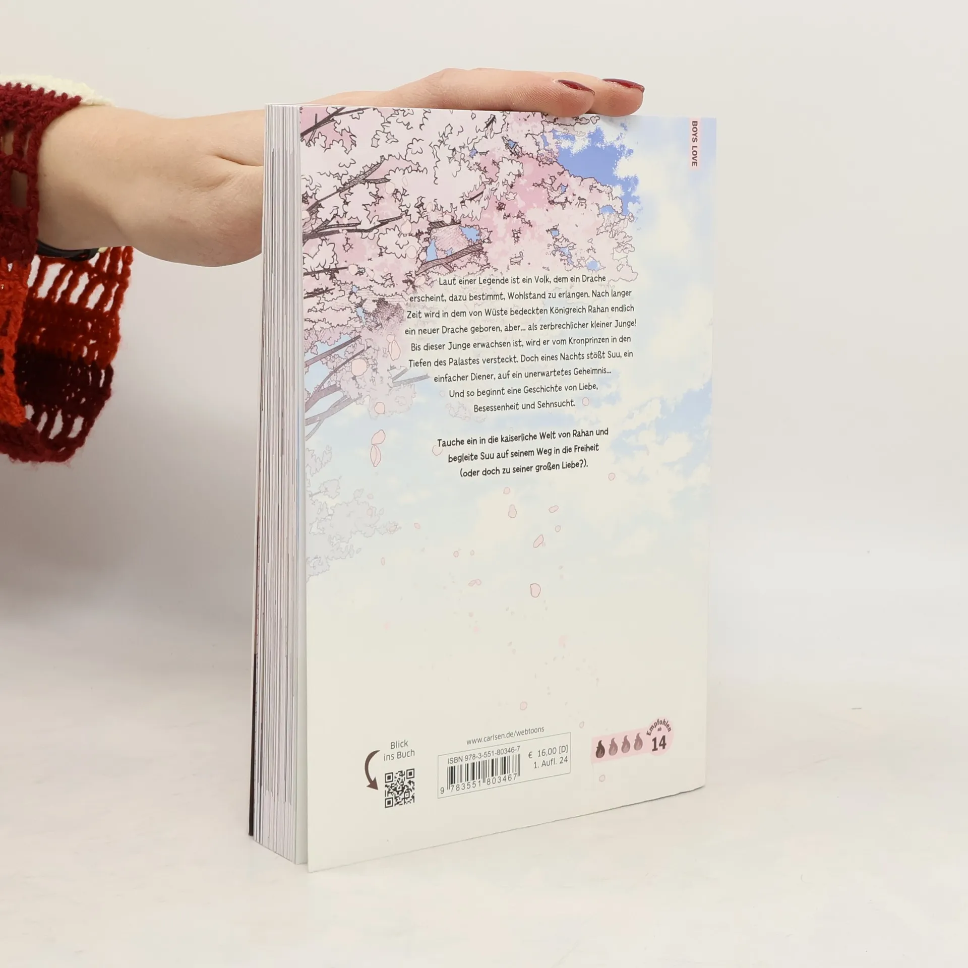 Ein verborgenes Kind und das Schicksal eines Königreichs Laut einer Legende ist ein Volk, dem ein Drache erscheint, dazu bestimmt, Wohlstand zu erlangen. Nach langer Zeit wird in dem von Wüste bedeckten Königreich Rahan endlich ein neuer Drache geboren, aber... als zerbrechlicher kleiner Junge! Bis dieser Junge erwachsen ist, wird er vom Kronprinzen in den Tiefen des Palastes versteckt. Doch eines Nachts stößt Suu, ein einfacher Diener, auf ein unerwartetes Geheimnis... Und so beginnt eine Geschichte von Liebe, Besessenheit und Sehnsucht. Dieser Band ist komplett in Farbe Abgeschlossen in 10 Bänden Spice-Level: 1 von 4 Flammen. Erotik spielt in diesem Boys-Love-Titel eine kleinere Rolle. Ideal für Einsteiger*innen Mit toller Photocard in der 1. Auflage Dies ist Band 1 der Serie. Eine packende Geschichte über die kaiserliche Welt von Rahan und Suus Weg in die Freiheit (oder doch zu seiner großen Liebe?)