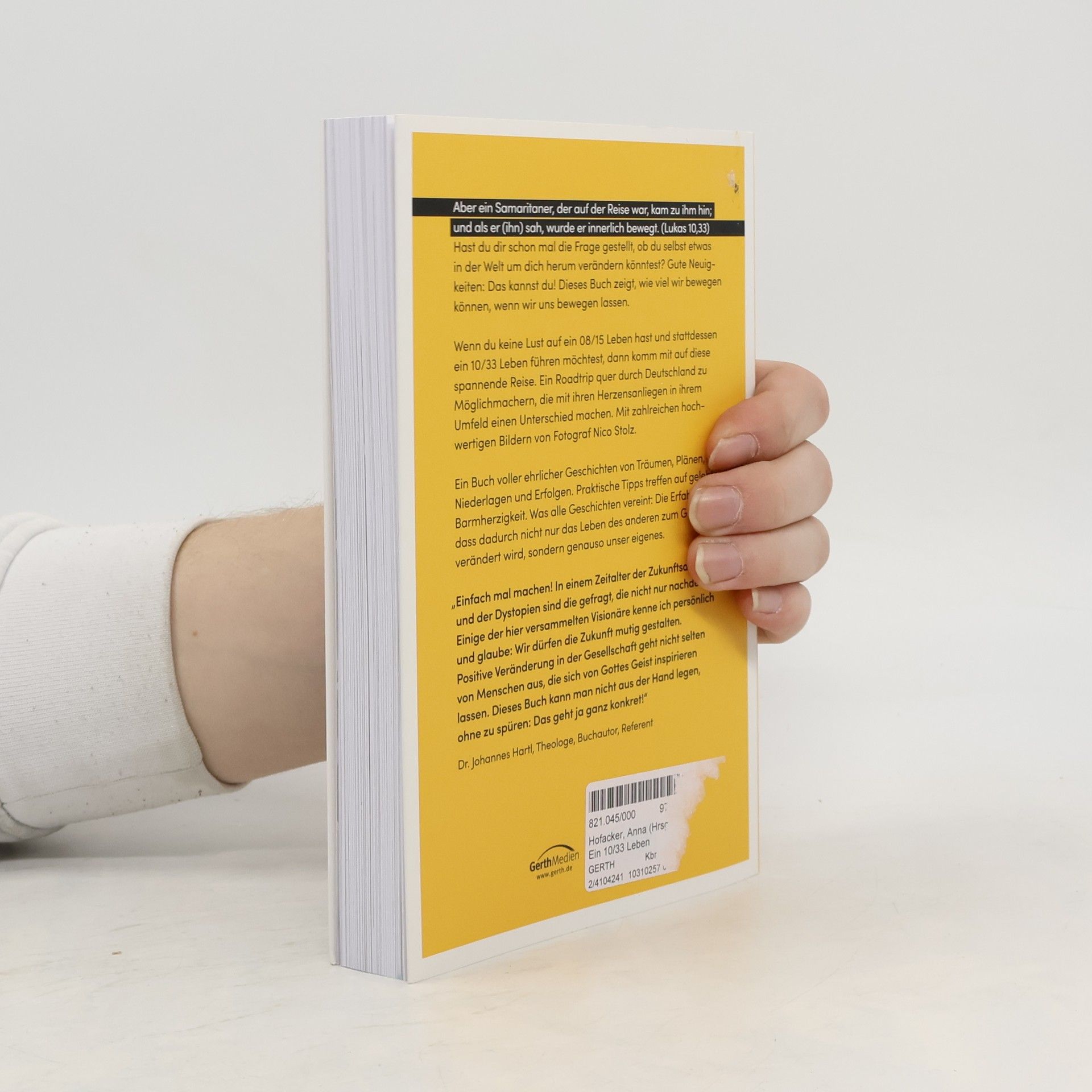 Der barmherzige Samariter begegnet einem Mann, der in Not ist. Und hilft ihm. Nachzulesen im Lukas-Evangelium 10,33. Hast du dir schon mal die Frage gestellt, ob du selbst auch etwas in der Welt um dich herum verändern könntest? Gute Neuigkeiten: Das kannst du! Dieses Buch zeigt, wie viel wir bewegen können, wenn wir uns bewegen lassen. Wenn du keine Lust auf ein 08/15 Leben hast und stattdessen ein 10/33 Leben führen möchtest, dann komm mit auf diese spannende Reise. Ein Roadtrip quer durch Deutschland zu Möglichmachern, die mit ihren Herzensanliegen in ihrem Umfeld einen Unterschied machen. Mit zahlreichen hochwertigen Bildern von Fotograf Nico Stolz. Ein Buch voller ehrlicher Geschichten von Träumen, Plänen, Niederlagen und Erfolgen. Praktische Tipps treffen auf gelebte Barmherzigkeit. Was alle Geschichten vereint: Die Erfahrung, dass dadurch nicht nur das Leben des anderen zum Guten verändert wird, sondern genauso unser eigenes.
