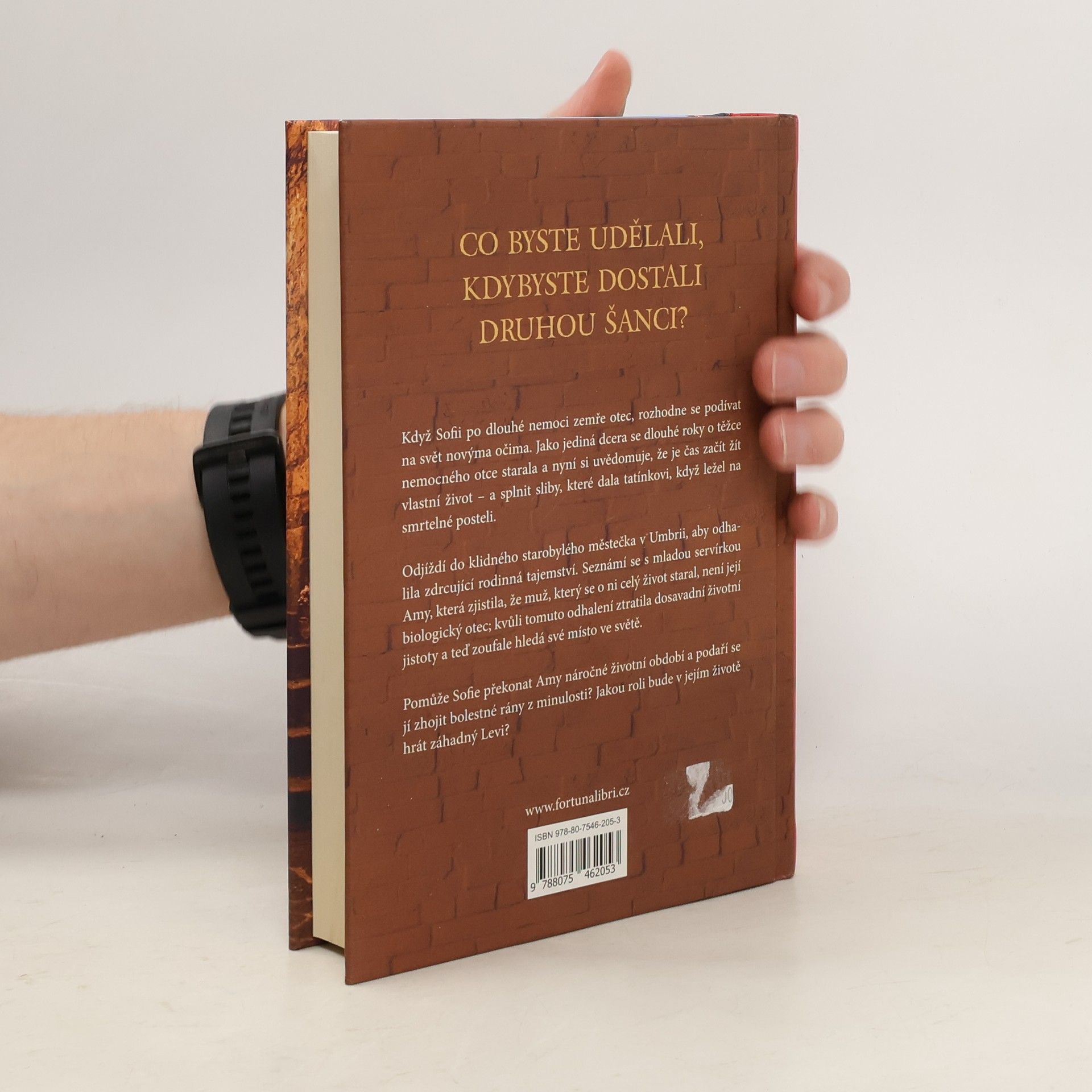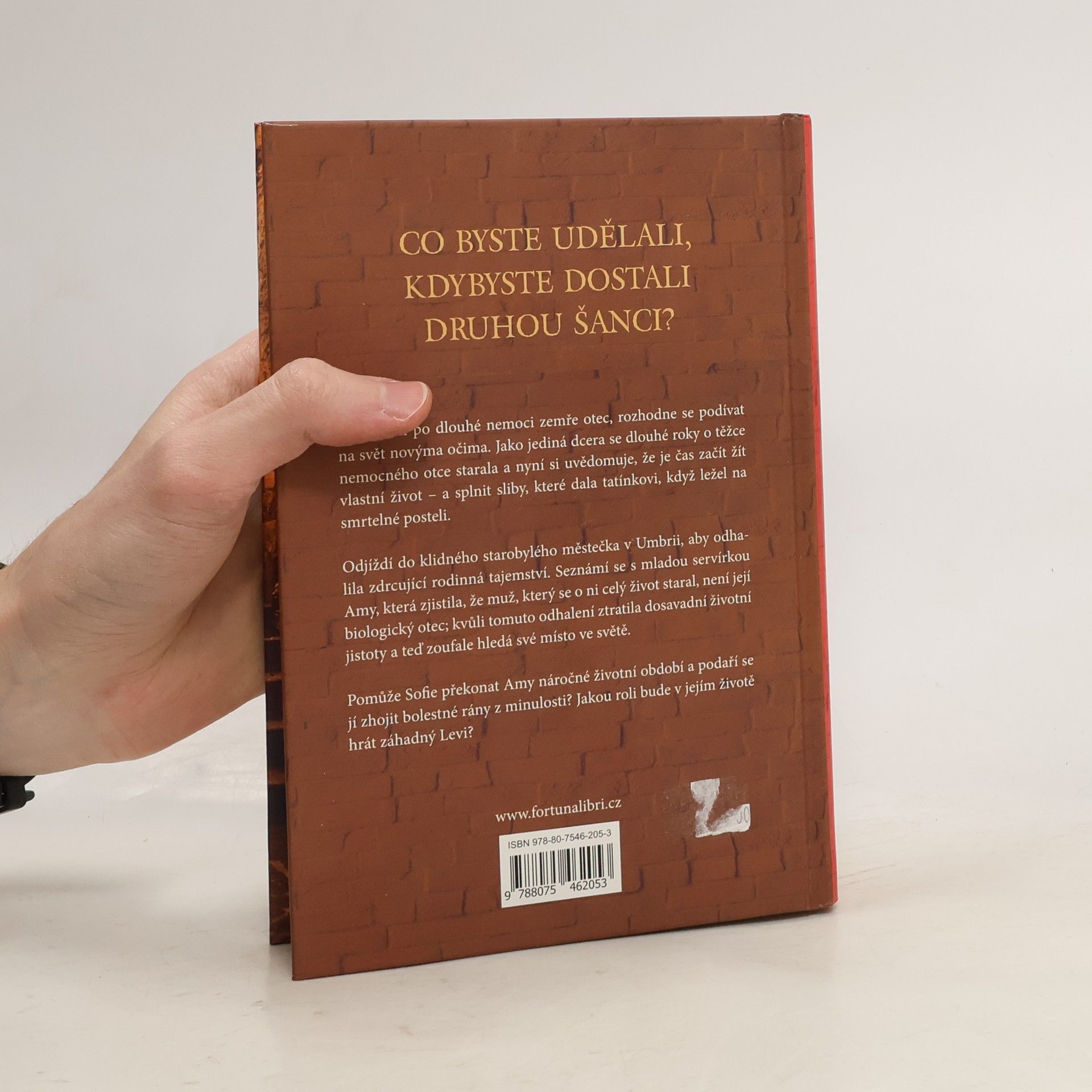 Co byste udělali, kdybyste dostali druhou šanci? Když Sofii po dlouhé nemoci zemře otec, rozhodne se podívat na svět novýma očima. Jako jediná dcera se dlouhé roky o těžce nemocného otce starala a nyní si uvědomuje, že je čas začít žít vlastní život – a splnit sliby, které dala tatínkovi, když ležel na smrtelné posteli. Odjíždí do klidného starobylého městečka v Umbrii, aby odhalila zdrcující rodinná tajemství. Zde se seznámí s mladou servírkou Amy, která zjistila, že muž, který se o ni celý život staral, není její biologický otec; kvůli tomuto odhalení ztratila dosavadní životní jistoty a teď zoufale hledá své místo ve světě. Pomůže Sofie překonat Amy náročné životní období a podaří se jí zhojit bolestné rány z minulosti? Nebo její novou životní cestu osudově překříží záhadný Levi?