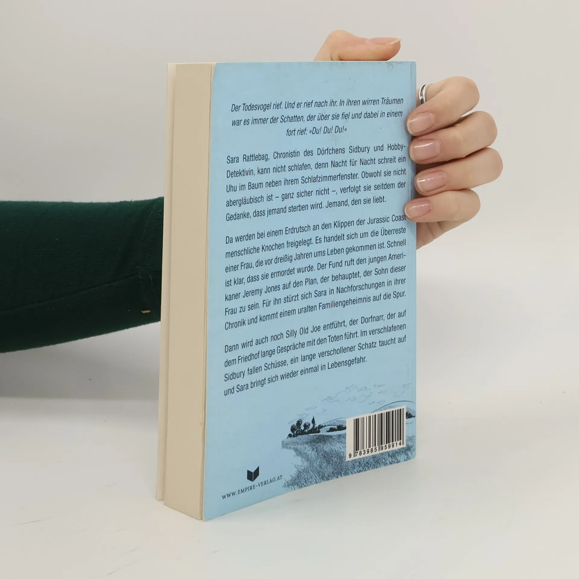 Der Todesvogel rief. Und er rief nach ihr. In ihren wirren Träumen war es immer der Schatten, der über sie fiel und dabei in einem fort rief: »Du! Du! Du!« Sara Rattlebag, Chronistin des Dörfchens Sidbury und Hobby-Detektivin, kann nicht schlafen, denn Nacht für Nacht schreit ein Uhu in dem Baum neben ihrem Schlafzimmerfenster. Auch wenn sie nicht abergläubisch ist – ganz sicher nicht –, lässt sie der Gedanke nicht aus, dass jemand sterben wird. Jemand, den sie liebt. Um sich abzulenken, beschäftigt sie sich mit Handarbeiten. Da werden bei einem Erdrutsch an den Klippen der Jurassic Coast menschliche Knochen freigelegt. Es handelt sich um die Überreste einer Frau, die vor dreißig Jahren ums Leben gekommen ist. Schnell ist klar, dass sie ermordet wurde. Der Fund ruft den jungen Amerikaner Jeremy Jones auf den Plan, der behauptet, der Sohn dieser Frau zu sein. Für ihn stürzt sich Sara Rattlebag in Nachforschungen in ihrer Chronik, doch dann wird Silly Old Joe entführt, der Dorfnarr, der auf dem Friedhof immer lange Gespräche mit den Toten führt. Im verschlafenen Sidbury fallen Schüsse, ein lange verschollener Schatz taucht auf und Sara bringt sich wieder einmal in Lebensgefahr.
