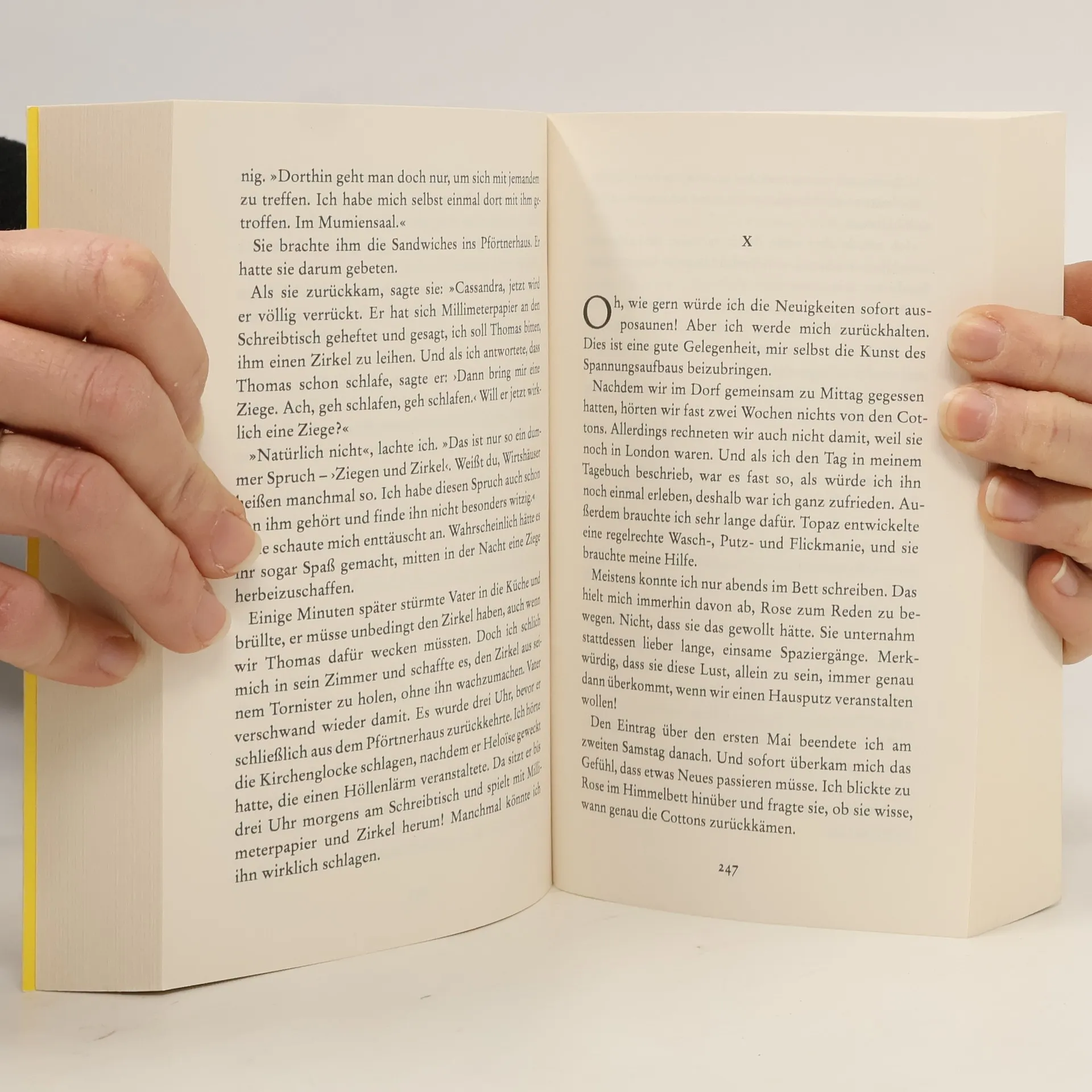 »Während ich das hier schreibe, sitze ich im Spülbecken«, lautet ein Eintrag in Cassandra Mortmains Tagebuch. Die 17-Jährige lebt mit Vater, Stiefmutter, Schwester und Bruder in einem heruntergekommenen Schloss auf dem Land und langweilt sich. Zum Zeitvertreib übt sie sich im Schreiben, und das am liebsten über ihre unkonventionelle verarmte Künstlerfamilie: den Schriftsteller-Vater, dessen erster Roman sich grandios verkauft hat, der aber seither unter einer Schreibblockade leidet und sich in Kriminalromane vergräbt, die einst glamouröse Model-Stiefmutter, die mit Vorliebe nackt durch die Landschaft spaziert, die schöne, aber meist missmutige Schwester Rose und den kleinen, aber schlauen Bruder Thomas. Dann stirbt überraschend der Schlossbesitzer, und als die Erben, zwei amerikanische Gentlemen, auftauchen, nimmt das Leben der Familie eine unerwartete Wendung.