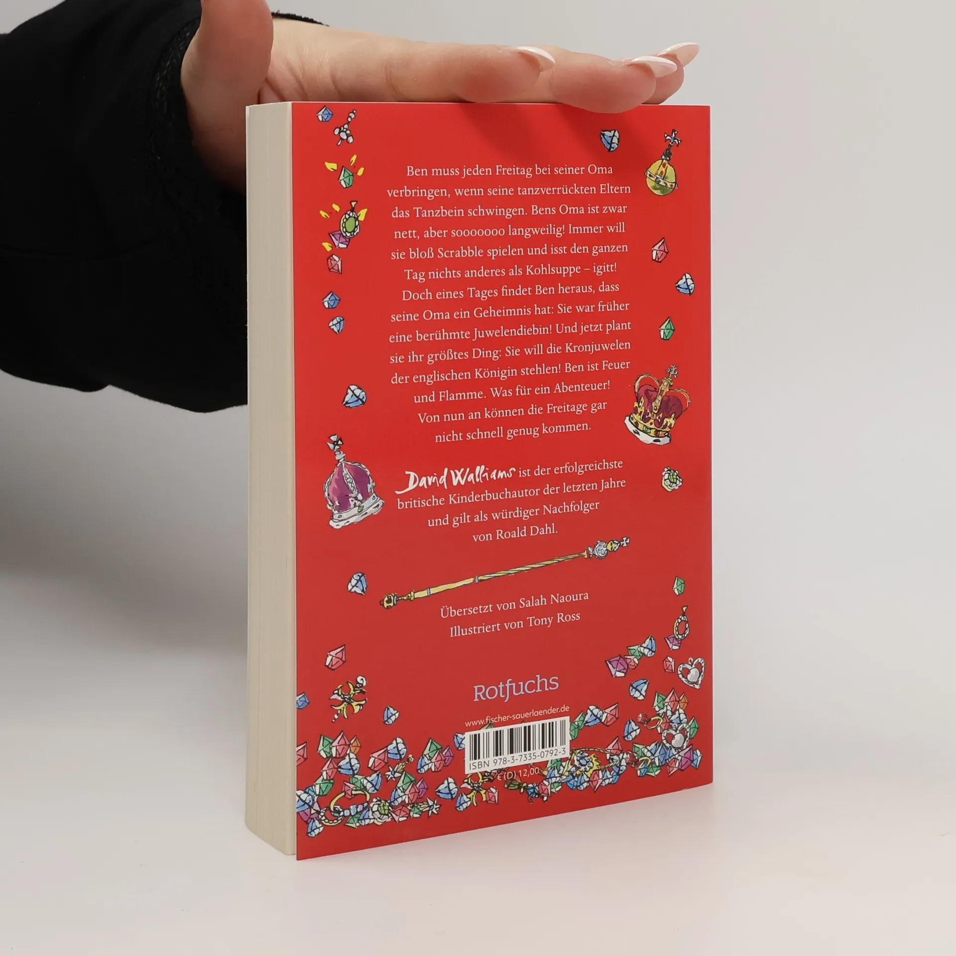 Ben muss jeden Freitag bei seiner Oma verbringen, wenn seine tanzverrückten Eltern das Tanzbein schwingen. Bens Oma ist zwar nett, aber sooooooo langweilig! Immer will sie bloß Scrabble spielen und isst den ganzen Tag nichts anderes als Kohlsuppe – igitt! Doch eines Tages findet Ben heraus, dass seine Oma ein Geheimnis hat: Sie war früher eine berühmte Juwelendiebin! Und jetzt plant sie ihr größtes Ding: Sie will die Kronjuwelen der englischen Königin stehlen! Ben ist Feuer und Flamme. Was für ein Abenteuer! Von nun an können die Freitage gar nicht schnell genug kommen.