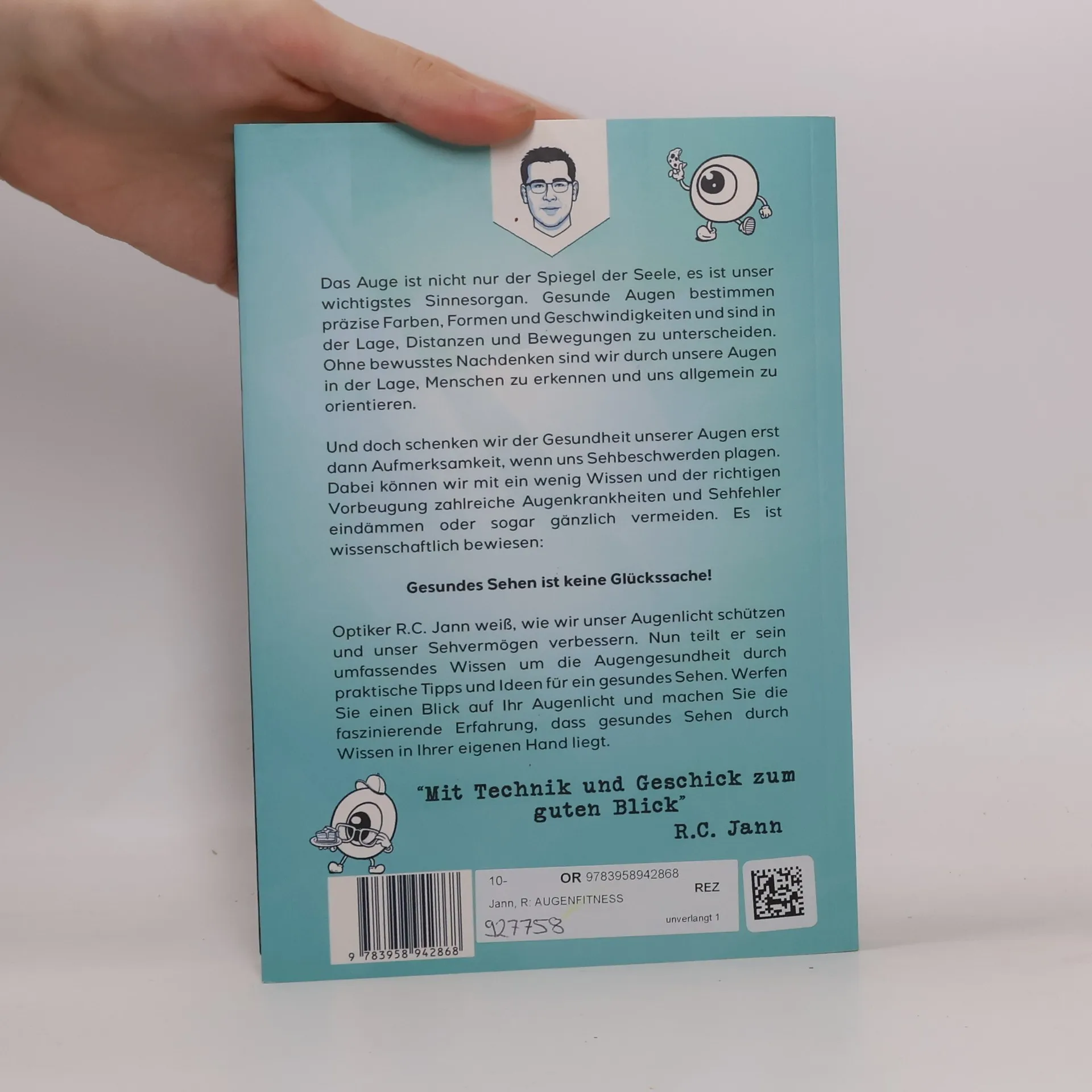 Das Auge ist nicht nur der Spiegel der Seele, es ist unser wichtigstes Sinnesorgan. Gesunde Augen bestimmen präzise Farben, Formen und Geschwindigkeiten und sind in der Lage, Distanzen und Bewegungen zu unterscheiden. Ohne bewusstes Nachdenken sind wir durch unsere Augen in der Lage, Menschen zu erkennen und uns allgemein zu orientieren. Und doch schenken wir der Gesundheit unserer Augen erst dann Aufmerksamkeit, wenn uns Sehbeschwerden plagen. Dabei können wir mit ein wenig Wissen und der richtigen Vorbeugung zahlreiche Augenkrankheiten und Sehfehler eindämmen oder sogar gänzlich vermeiden. Es ist wissenschaftlich bewiesen: Gesundes Sehen ist keine Glückssache! Optiker R. C. Jann weiß, wie wir unser Augenlicht schützen und unser Sehvermögen verbessern. Nun teilt er sein umfassendes Wissen um die Augengesundheit durch praktische Tipps und Ideen für ein gesundes Sehen. Werfen Sie einen Blick auf Ihr Augenlicht und machen Sie die faszinierende Erfahrung, dass gesundes Sehen durch Wissen in Ihrer eigenen Hand liegt. 'Mit Technik und Geschick zum guten Blick!' - R. C. Jann Inklusive Gesundheits-App für iOS und Android. Mit Checklisten, unterhaltsamen Illustrationen und Übungen.
