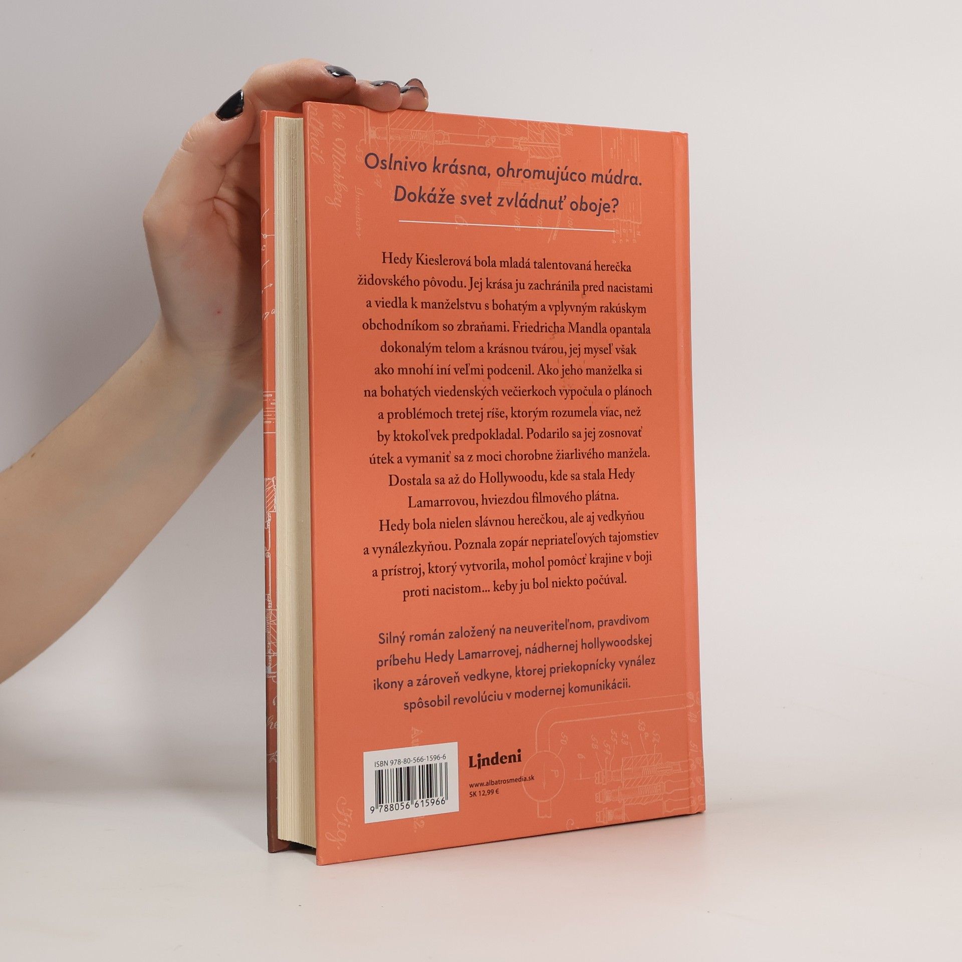 Oslnivo krásna, ohromujúco múdra. Dokáže svet zvládnuť oboje? Oslnivo krásna, ohromujúco múdra. Dokáže svet zvládnuť oboje? Hedy Kieslerová bola mladá talentovaná herečka židovského pôvodu. Jej krása ju zachránila pred nacistami a viedla k manželstvu s bohatým a vplyvným rakúskym obchodníkom so zbraňami. Friedricha Mandla opantala dokonalým telom a krásnou tvárou, jej myseľ však ako mnohí iní veľmi podcenil. Ako jeho manželka si na bohatých viedenských večierkoch vypočula o plánoch a problémoch tretej ríše, ktorým rozumela viac, než by ktokoľvek predpokladal. Podarilo sa jej zosnovať útek a vymaniť sa z moci chorobne žiarlivého manžela. Dostala sa až do Hollywoodu, kde sa stala Hedy Lamarrovou, hviezdou filmového plátna. Hedy okrem úspešnej hereckej kariéry bola aj vedkyňou a vynálezkyňou. Poznala zopár nepriateľových tajomstiev a prístroj, ktorý vytvorila, mohol pomôcť krajine v boji proti nacistom... keby ju bol niekto počúval. Silný román založený na neuveriteľnom, pravdivom príbehu Hedy Lamarrovej, nádhernej hollywoodskej ikony a zároveň vedkyne, ktorej priekopnícky vynález spôsobil revolúciu v modernej komunikácii.