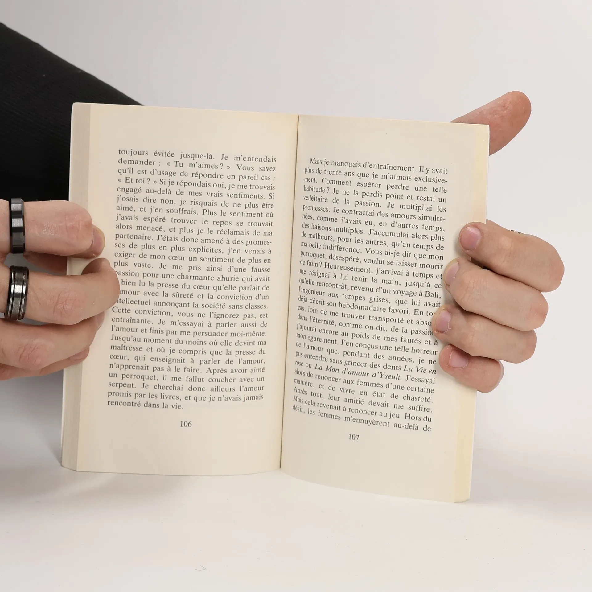 « Sur le pont, je passai derrière une forme penchée sur le parapet, et qui semblait regarder le fleuve. De plus près, je distinguai une mince jeune femme, habillée de noir. Entre les cheveux sombres et le col du manteau, on voyait seulement une nuque, fraîche et mouillée, à laquelle je fus sensible. Mais je poursuivis ma route, après une hésitation. [...] J'avais déjà parcouru une cinquantaine de mètres à peu près, lorsque j'entendis le bruit, qui, malgré la distance, me parut formidable dans le silence nocturne, d'un corps qui s'abat sur l'eau. Je m'arrêtai net, mais sans me retourner. Presque aussitôt, j'entendis un cri, plusieurs fois répété, qui descendait lui aussi le fleuve, puis s'éteignit brusquement. »