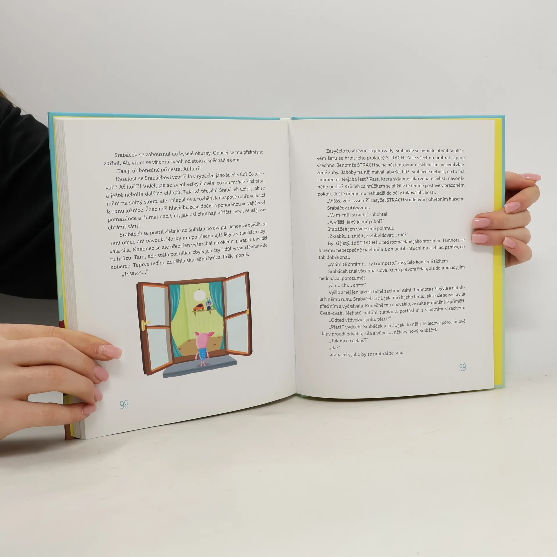 Říkají mu sice Srabáček, ale když zmizí plyšovému prasátku jeho milovaná kamarádka kačenka Kčenka, a s ní i miminko a celá rodina, stane z něj najednou neohrožený hrdina. Srabáček se vydává na dobrodružnou cestu za záchranou Kačenky a své rodiny. Parťákem mu je vypelichaný, ale zkušený papoušek Žako. Po cestě plné napínavých a humorných příhod se dostávají konečně na místo činu – do chalupy pod věží, co vypadá jako raketa, aby na poslední chvíli zasáhli a zabránili neštěstí… Nebo je to nakonec všechno jinak? Originální příběh pro děti od 7 let a jejich velké dospělé.