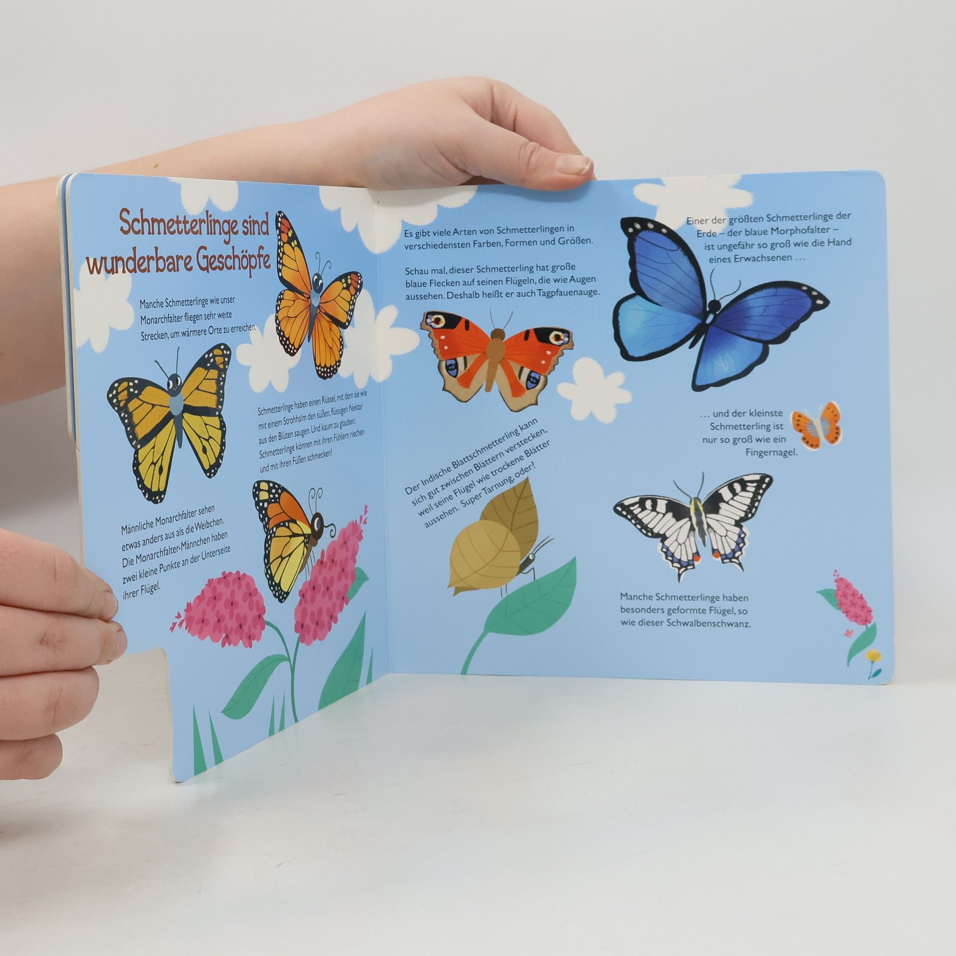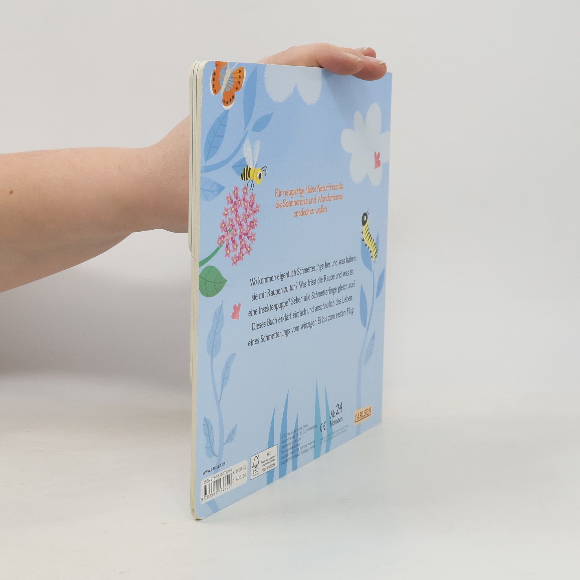 Erstes Buch mit klaren Bildern und einfachen Sachtexten für kleine Neugierige! Zuerst ist da ein Ei. Aus dem Ei schlüft eine kleine Raupe, die frisst und krabbelt, frisst und krabbelt und verpuppt sich. Dann wird aus der unscheinbaren Puppe ein bunter Schmetterling, der hinwegflattert. Die Verwandlung von der Raupe zum Schmetterling — anschaulich erklärt Mit charmanter Registerstanzung Weckt die Neugier auf die Wunder der Natur