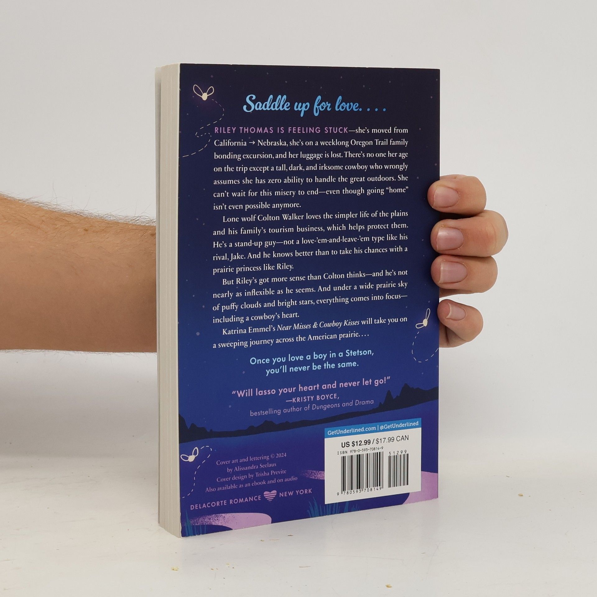 A swoon-worthy YA rivals-to-lovers romance between a Nebraskan cowboy and California girl, thrust together on the Oregon Trail. Anything’s possible under a prairie sky… Riley Thomas is feeling stuck—she’s moved from California to Nebraska, she’s on a weeklong Oregon Trail family bonding excursion, and her luggage is lost. There’s no one her age on the trip except a tall, dark and irksome cowboy who wrongly assumes she has zero ability to handle the great outdoors. She can’t wait for this misery to end—even though going “home” isn’t even possible anymore. Lone wolf Colton Walker loves the simpler life of the plains and his family’s tourism business that helps protect them. He’s a stand-up guy—not a love ‘em and leave ‘em type like his rival, Jake. And he knows better than to take his chances with a prairie princess like Riley. But Riley’s got more sense than Colton thinks--and he’s not nearly as inflexible as he seems. And under a wide prairie sky of puffy clouds and bright stars, everything comes into focus--including a cowboy’s heart. Katrina Emmel’s Near Misses and Cowboy Kisses will take you on a sweeping journey across the American prairie . . . once you love a boy in a Stetson, you’ll never be the same.