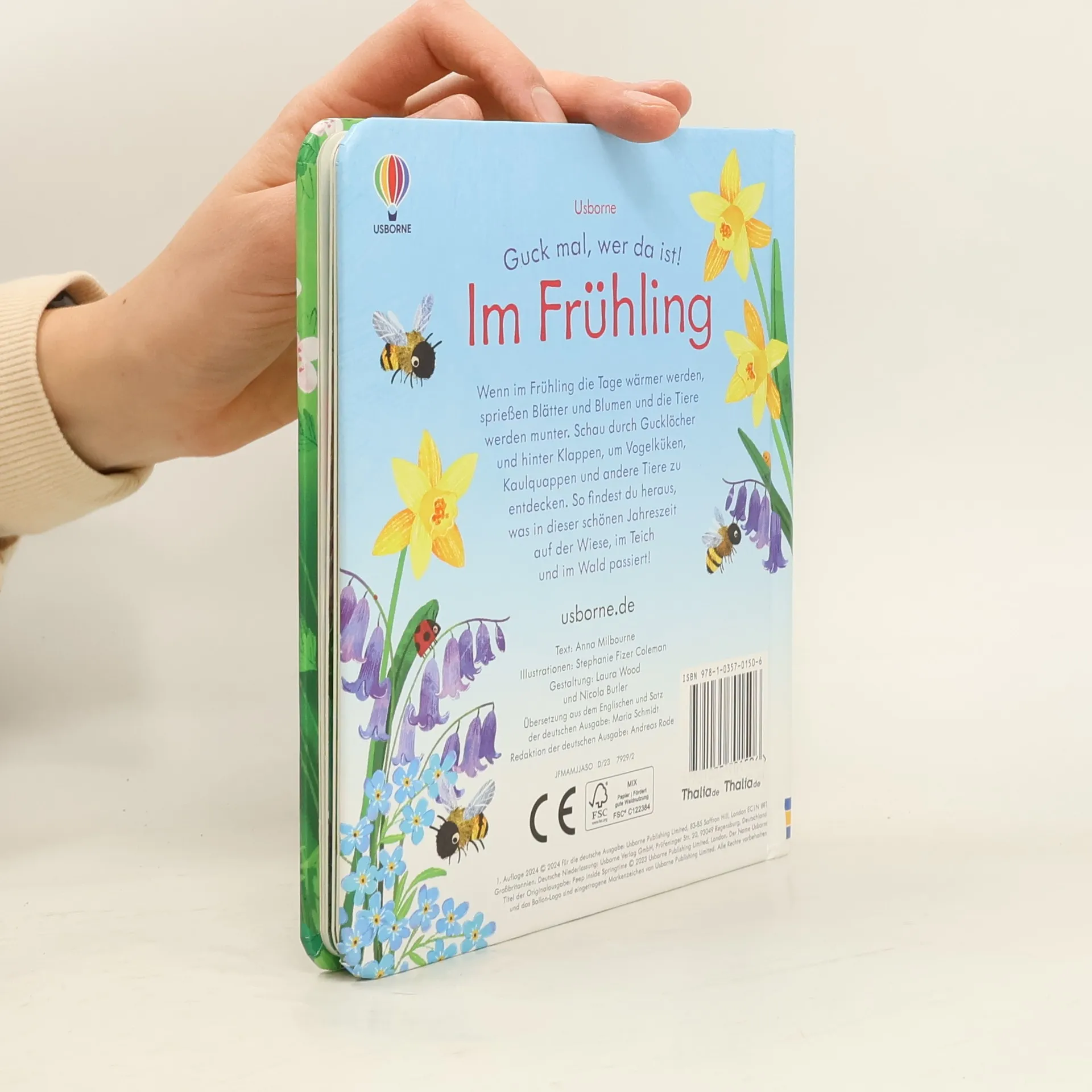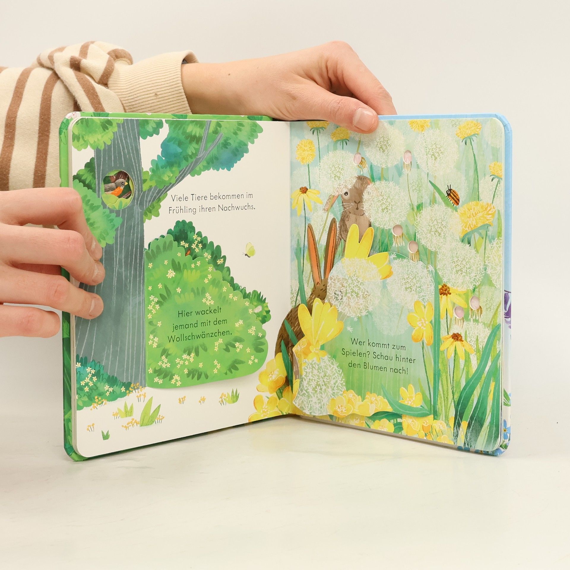 Was wächst und sprießt denn da im Frühling? Wenn im Frühling die Tage wärmer werden, sprießen Blätter und Blumen und die Tiere werden munter. Schau durch Gucklöcher und hinter Klappen, um Vogelküken, Kaulquappen und andere Tiere zu entdecken. So findest du heraus, was in dieser schönen Jahreszeit auf der Wiese, im Teich und im Wald passiert! • Schneeglöckchen, Krokusse, Bienen, Kaulquappen, Küken u. v. m. • Verständliche Informationen über Jahreszeiten, Wetter, Lebenszyklen und Tiere • Mit Klappen und Gucklöchern auf jeder Doppelseite