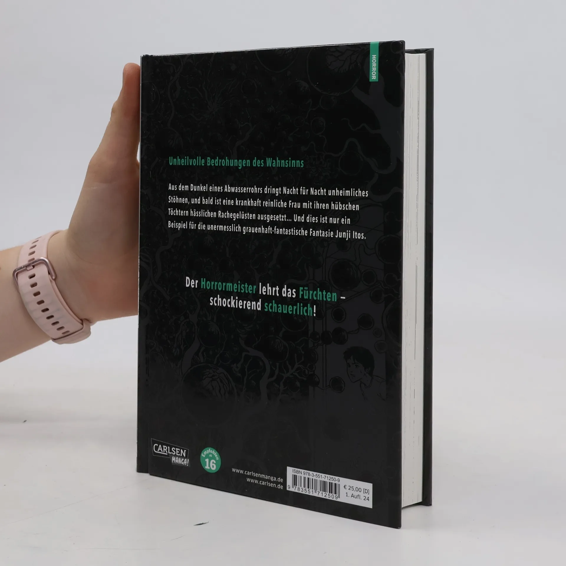 Meisterhafter Grusel aus Japan Zwei Schwestern und ihre putzbesessene Mutter sind zunächst nur leicht genervt, weil ihre Abflüsse verstopft sind. Bis diese beginnen übel zu riechen und zu stöhnen … Und dieses ist nur ein Beispiel für die unermesslich grauenhaft-fantastische Fantasie Junji Itos. In acht Geschichten lehrt uns der Horrormeister das Fürchten – schockierend schauerlich! Ein neuer, schonungsloser Streich aus der Feder von UZUMAKI-Autor Junji Ito! Perfekt für Leser*innen mit Nerven aus Stahl ab 16 Jahren. Diese Geschichten findest Du in GROANING DRAIN - HORROR AUS DEM UNTERGRUND: Ein übernatürlicher Schulwechsel Groaning Drain Blutfrüchte Henkerballon Das Marionettenhaus Fleischfarbe ist schick Vom Radar verschwunden Tief im Boden
