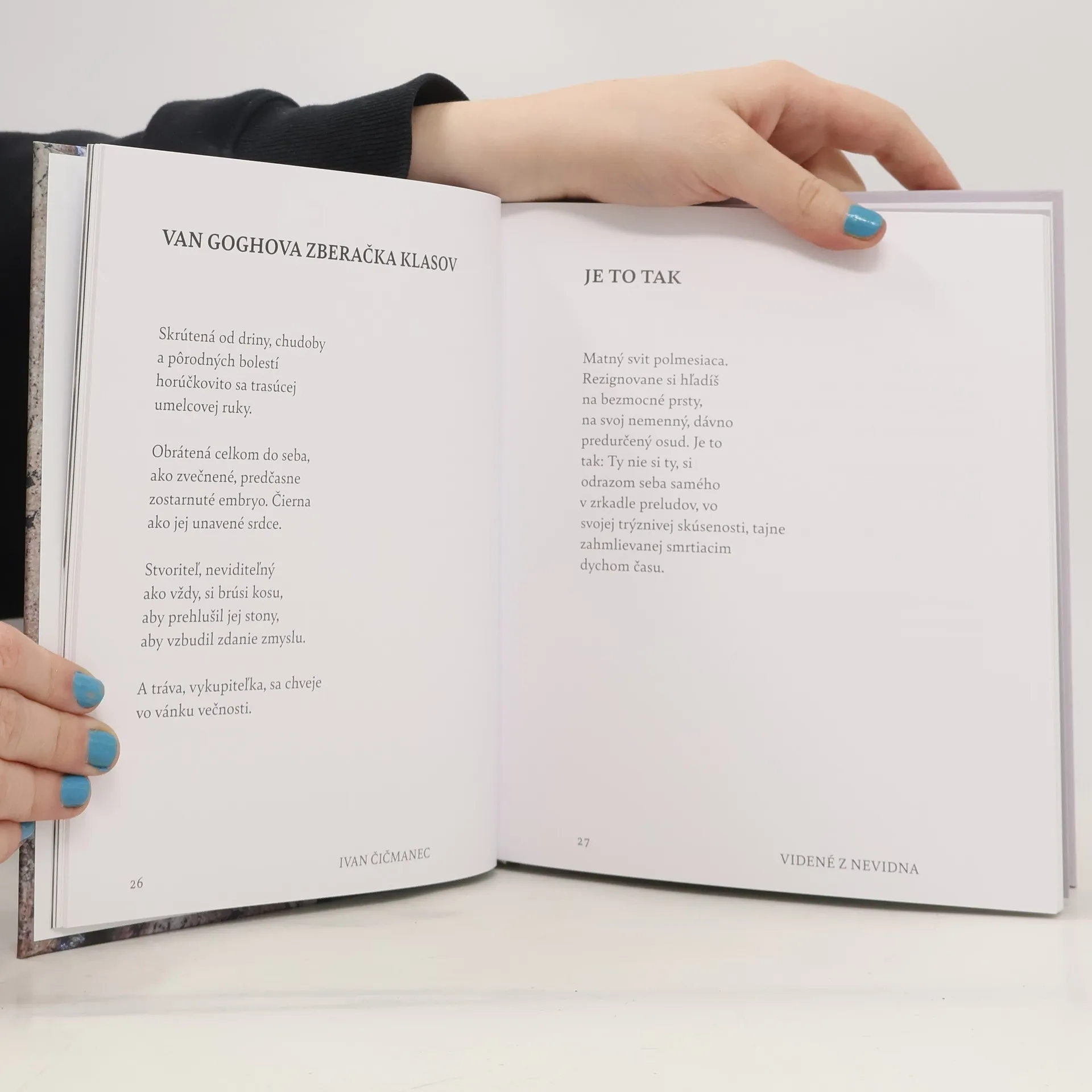 Táto kniha určite nie je všedná. Je to antológia poetiek a básnikov, ktorí sú alebo boli (tí, čo už nie sú medzi nami) nevidiaci. Niektorých pripravil osud o zrak od narodenia, iní oň prišli v detstve či v dospelosti. Uzavretí do večnej tmy – ale ich verše svedčia o tom, koľko z nášho sveta v skutočnosti vidia, koľko toho o ňom vedia, koľko vedia o ľudských vzťahoch a podstate nášho bytia! Zvykne sa hovoriť, že ľudia, ktorí nedisponujú tým azda najdôležitejším ľudským zmyslom, sú obdarení vyššou mierou senzitivity ostatných zmyslov. Asi to platí. Ale tí, ktorých básne sú v tejto knihe, disponujú aj schopnosťou tvorivo narábať so slovami a ich významami, esteticky zobraziť „nevidenú“ realitu, svoje poznanie, pocity a city. Ich situáciu presne vystihujú verše jedného z nich, Ivana Čičmanca: „Tam v tichosti, v tme, / ktorá už nie je tmou, vnútorným / hmatom znovuobjavíš / poddajné kontúry všetkých vecí, /ich tajomné, sebatvorné /opojenie...“ Čítajte, prosím, túto knihu s otvorenými očami a srdcom, ale aj „vnútorným hmatom“! Knihu inicioval a zostavil Milan Resutík a edične pripravil Igor Hochel. Ako ilustrácie sú použité výtvarné diela nevidiacej sochárky Marianny Jánošíkovej-Machalovej, dizajn a zalomenie publikácie Matúš Chalupa. Celá publikácia je k dispozícii aj jako audiokniha cez QR kód, ktorý je uvedený na záložke v knihe.