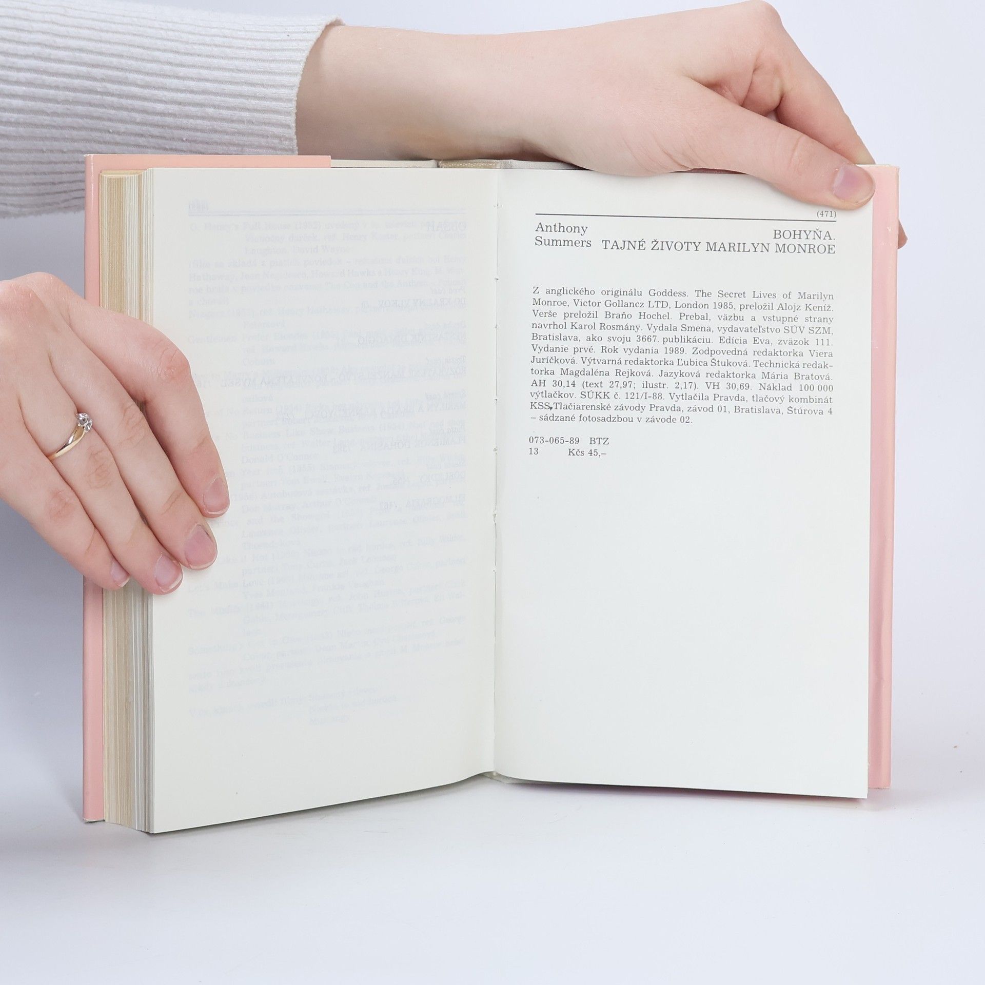 Už veľa kníh sa napísalo o živote slávnej americkej herečky Marilyn Monroe. Životné osudy tejto rozporuplnej osobnosti sa znovu odvíjajú pred zrakmi čitateľov v rôznych žánrových podobách - od reportáží až po rozsiahle biografie. No literárne hodnoty týchto diel sú rôzne, veľmi odlišné. V mnohých prípadoch prevláda úsilie vytvárať lacné efekty zo senzačných objavov, pričom zjevne dochádza k výraznému narušeniu proporcionality medzi fikciou, skutočnosťou a výmyslom. Kniha od anglického novinára Anthonyho Summersa je jednou z tých vzácnejších výnimiek literárneho spracovania životopisného materiálu Marylin Monroe, v ktorom prevláda seriózny prístup. Autor sitlivo vyhmatáva hranice medzi autentickým, potvrdeným javom a domnienkou, respektive polopravdou. Opiera sa o autentické výpovede autentických osôb, ale nepovyšuje jedny výpovede nad druhé, hľadá vzájomné súvislosti a konfrontuje jednotlivé názory, pohľady a predstavy. Takto vznikol portrét slávnej herečky, viacrozmerný, viacvrstevný, viacfarebný. Marilyn Monroe ožíva pred čitateľom ako žena plná paradoxov, ako symbol sexu, ktorý nenašiel šťastie v láske, ako herečka, ktorý bola vždy prestrašená, keď mala vystúpiť pred verejnosťou, ako žijúca legenda, umelo živený mýtus, za ktorým sa ukrýval psychický ztroskotanec.