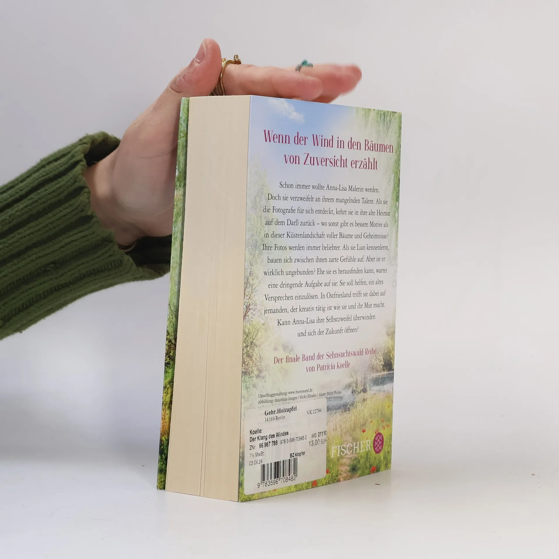 Ein Buch wie eine Umarmung – der finale Band der Sehnsuchtswald-Reihe von Bestseller-Autorin Patricia Koelle Schon immer wollte Anna-Lisa Malerin werden. Doch sie verzweifelt an ihrem mangelnden Talent. Als sie die Fotografie für sich entdeckt, kehrt sie in ihre alte Heimat auf dem Darß zurück – wo sonst gibt es bessere Motive als in dieser Küstenlandschaft voller Bäume und Geheimnisse? Ihre Fotos werden immer beliebter. Doch es reicht nicht aus, um den Traum von einem eigenen Fotostudio zu erfüllen. Als sie Lian kennenlernt, bauen sich zarte Gefühle auf. Aber ist er wirklich ungebunden? Ehe sie es herausfinden kann, wartet eine dringende Aufgabe auf sie: Sie soll helfen, ein altes Versprechen einzulösen. In Ostfriesland trifft sie dabei auf jemanden, der kreativ tätig ist wie sie und ihr Mut macht. Kann Anna-Lisa ihre Selbstzweifel überwinden und sich der Zukunft öffnen? Die Sehnsuchtswald-Reihe: Band 1: Das Licht in den Bäumen Band 2: Das Glück in den Wäldern Band 3: Das Leuchten der Blätter Band 4: Der Klang des Windes Die Romane sind auch unabhängig voneinander ein großer Lesegenuss.