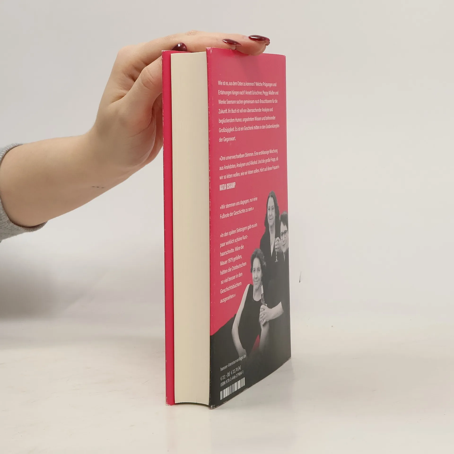 „Eine erstklassige Mischung aus Anekdoten, Analysen und Alkohol. Und die große Frage, ob wir so leben wollen, wie wir leben sollen. Hört auf diese Frauen!“ Katja Oskamp Drei Freundinnen, ein Küchentisch, vor den Fenstern die Nacht: Annett Gröschner, Peggy Mädler und Wenke Seemann reden. Über sich als „Ostfrauen“, was auch immer diese Schublade bedeutet, über das Glück krummer Lebensläufe, über die Gegenwart mit ihrer sich ständig reindrängelnden Vergangenheit. Es wird getrunken, gelacht und gerungen, es geht um Erinnerungsfetzen und Widersprüche, um die Vielschichtigkeit von Prägungen und um mit den Jahren fremd gewordene Ideale. Im japanischen Volksglauben gibt es Geister, die aus achtlos weggeworfenen Dingen geboren werden – „wie sähe der Dinggeist der DDR aus?“, fragen die drei. Ihr Buch ist dem Erinnern und dem Sich-neu-Erfinden gegenüber so gewitzt und warmherzig, wie es jede große Gesellschaftsdiskussion verdient.