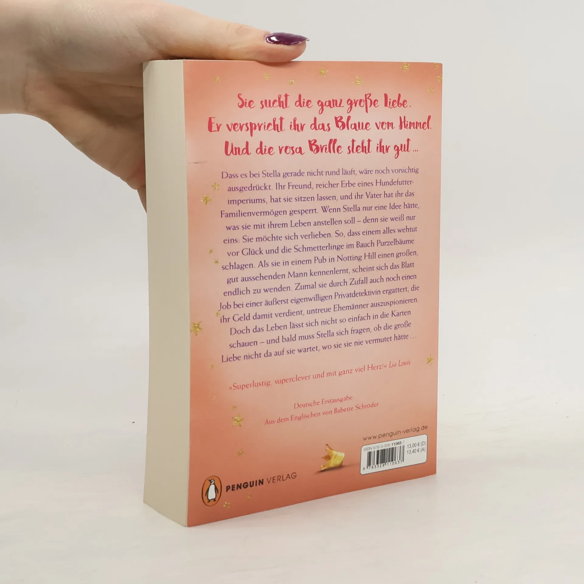 Sie sucht die ganz große Liebe. Er verspricht ihr das Blaue vom Himmel. Und die rosa Brille steht ihr gut … Dass es bei Stella gerade nicht rund läuft, wäre noch vorsichtig ausgedrückt. Ihr Freund, reicher Erbe eines Hundefutterimperiums, hat sie sitzen lassen, und ihr Vater hat ihr das Familienvermögen gesperrt. Wenn Stella nur wüsste, was sie mit ihrem Leben anstellen soll – denn sie weiß nur eins: Sie möchte sich verlieben. Und zwar so richtig. So, dass einem alles wehtut vor Glück und die Schmetterlinge im Bauch Purzelbäume schlagen. Als sie in einem Pub in Notting Hill einen großen, gut aussehenden Mann kennenlernt, scheint sich das Blatt endlich zu wenden. Zumal sie durch Zufall auch noch einen Job bei einer äußerst eigenwilligen Privatdetektivin ergattert, die ihr Geld damit verdient, untreue Ehemänner auszuspionieren. Doch das Leben lässt sich nicht so einfach in die Karten schauen – und bald muss Stella sich fragen, ob die große Liebe nicht doch da auf sie wartet, wo sie sie nie vermutet hätte …