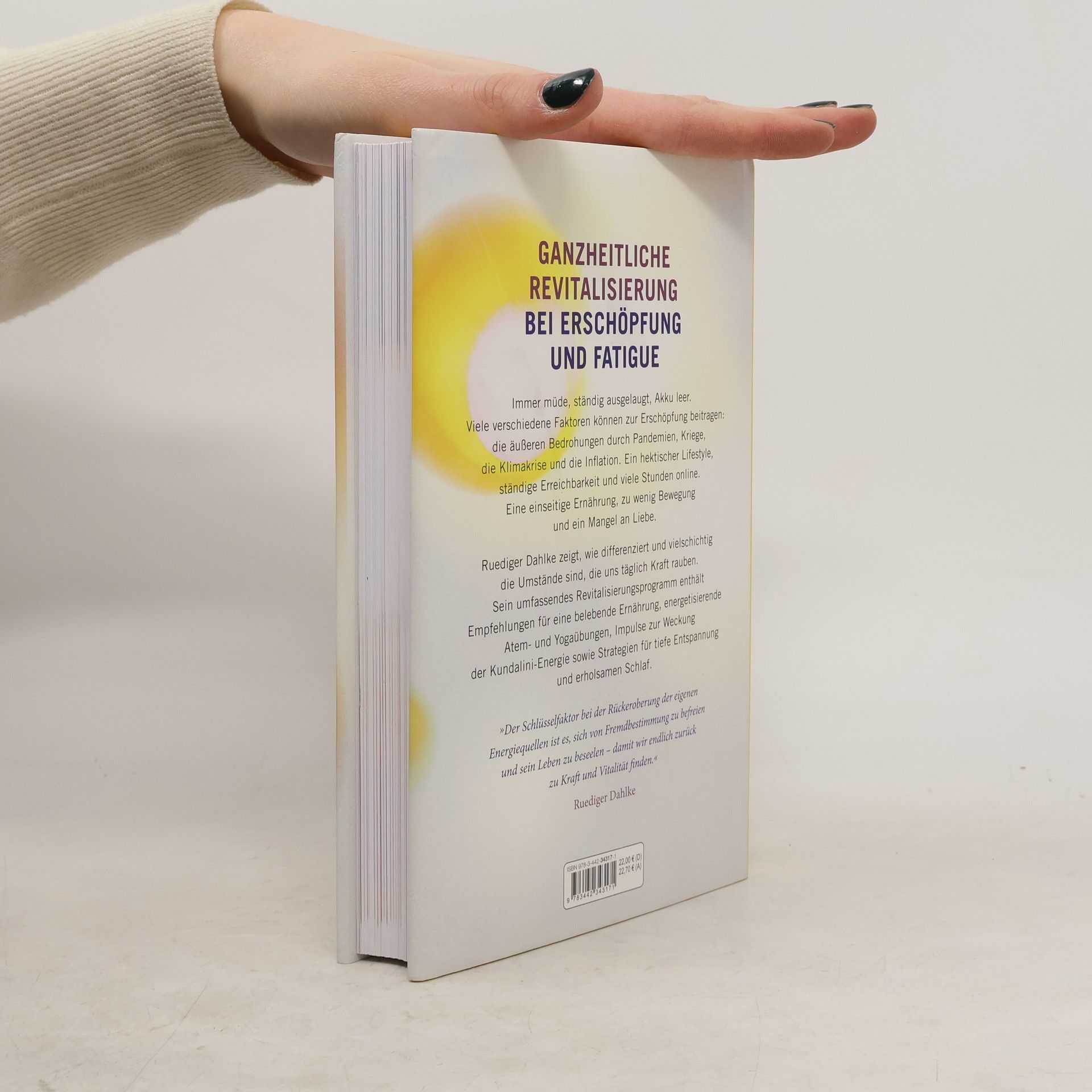 Ganzheitliche Revitalisierung bei Erschöpfung und Fatigue Immer müde, ständig ausgelaugt, Akku leer. Jede(r) Zweite ist von Symptomen betroffen, die von leichtem Unwohlsein bis zum Burn-out reichen. Die große Erschöpfung hat viele Gründe: Die äußeren Bedrohungen durch Pandemien, Kriege, die Klimakrise und die Inflation. Ein hektischer, zu schneller Lifestyle mit ständiger Erreichbarkeit und vielen Stunden online. Eine einseitige Ernährung, zu wenig Bewegung und Mangel an Liebe. Ruediger Dahlke zeigt, wie differenziert und vielschichtig die Faktoren sind, die uns täglich Kraft rauben. Sein umfassendes Revitalisierungs-Programm enthält Empfehlungen für eine lebendige Ernährung, energetisierende Atemübungen, Impulse zur Weckung der Kundalini-Energie und Strategien für tiefe Entspannung erholsamen Schlaf. Der Schlüsselfaktor bei der Rückeroberung der eigenen Energiequellen ist es, sich von Fremdbestimmung zu befreien und sein Leben zu beseelen – damit wir endlich zurück zu Kraft und Vitalität finden.