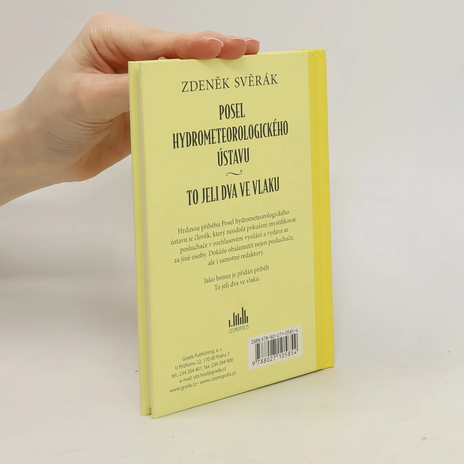 Hrdinou komedie Posel hydrometeorologického ústavu je člověk, který neodolá pokušení mystifikovat posluchače v rozhlasovém vysílání a vydává se za jiné osoby. Dokáže obalamutit nejen posluchače, ale i samotné redaktory. O svém „rozhlasovém žertu“ Posel hydrometeorologického ústavu – Zdeněk Svěrák říká: „Fascinovali mě tenkrát podvodníci a mystifikátoři. Tak dlouho jsem o nich psal povídky, až jsem se usadil na mystifikaci s Járou Cimrmanem.“ Posel hydrometeorologického ústavu Akademie věd byl natočen pro rozhlas dokonce dvakrát. V sedmdesátých letech však první verze musela být na příkaz shora zmazána, neboť režisér Jan Fuchs se octl na černé listině. V knižní podobě vychází „Posel“ vůbec poprvé. Jako bonus je do knihy přidána rozvedená slovní hříčka To jeli dva ve vlaku, která svým názvem připomíná začátek nějakého vtipu. Je na ní znát, že její autor byl venkovským učitelem a také, že miloval Fráňu Šrámka. Dva cestující – a co všechno se může odehrát…