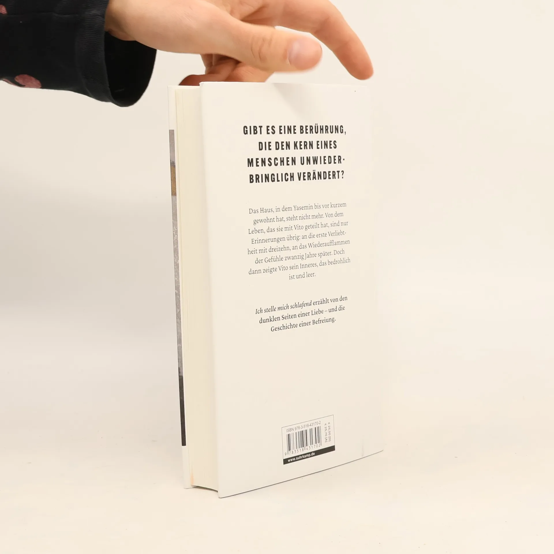 Das Haus, in dem Yasemin bis vor kurzem gelebt hat, steht nicht mehr. Es musste bis auf die Grundmauern abgerissen werden. Von der Wohnung, die sie zuletzt mit ihrem Freund Vito geteilt hat, sind nur Erinnerungen übrig. Die Geschichte der beiden reicht bis in ihre Jugend zurück: Beide wachsen im selben Hochhauskomplex auf, und Yasemin verliebt sich mit dreizehn in den drei Jahre älteren Nachbarn. Von klein auf fasziniert von Glaubensfragen und Spiritualität, versucht sie durch einen Liebeszauber, Vito für sich zu gewinnen. Doch nach einem Sanatoriumsaufenthalt, wo ihre Skoliose behandelt wird, geht sie auf Distanz. Zu fremd ist ihr der eigene Körper, zu groß die Scham wegen ihres Korsetts. Erst zwanzig Jahre später, als die mühsam aufgerichtete Wirbelsäule droht sich wieder zu stauchen, begegnen sie sich erneut. Yasemin hält dieses späte Aufflammen der Jugendliebe für Schicksal. Aber dann zeigt Vito sein Inneres, das bedrohlich ist und leer. Ich stelle mich schlafend erzählt von den dunklen Seiten einer Liebe – und die Geschichte einer Befreiung. Ein eindringlicher Roman über den Versuch einer Auslöschung und über die Frage, ob es eine Berührung gibt, die den Kern eines Menschen unwiederbringlich verändert.