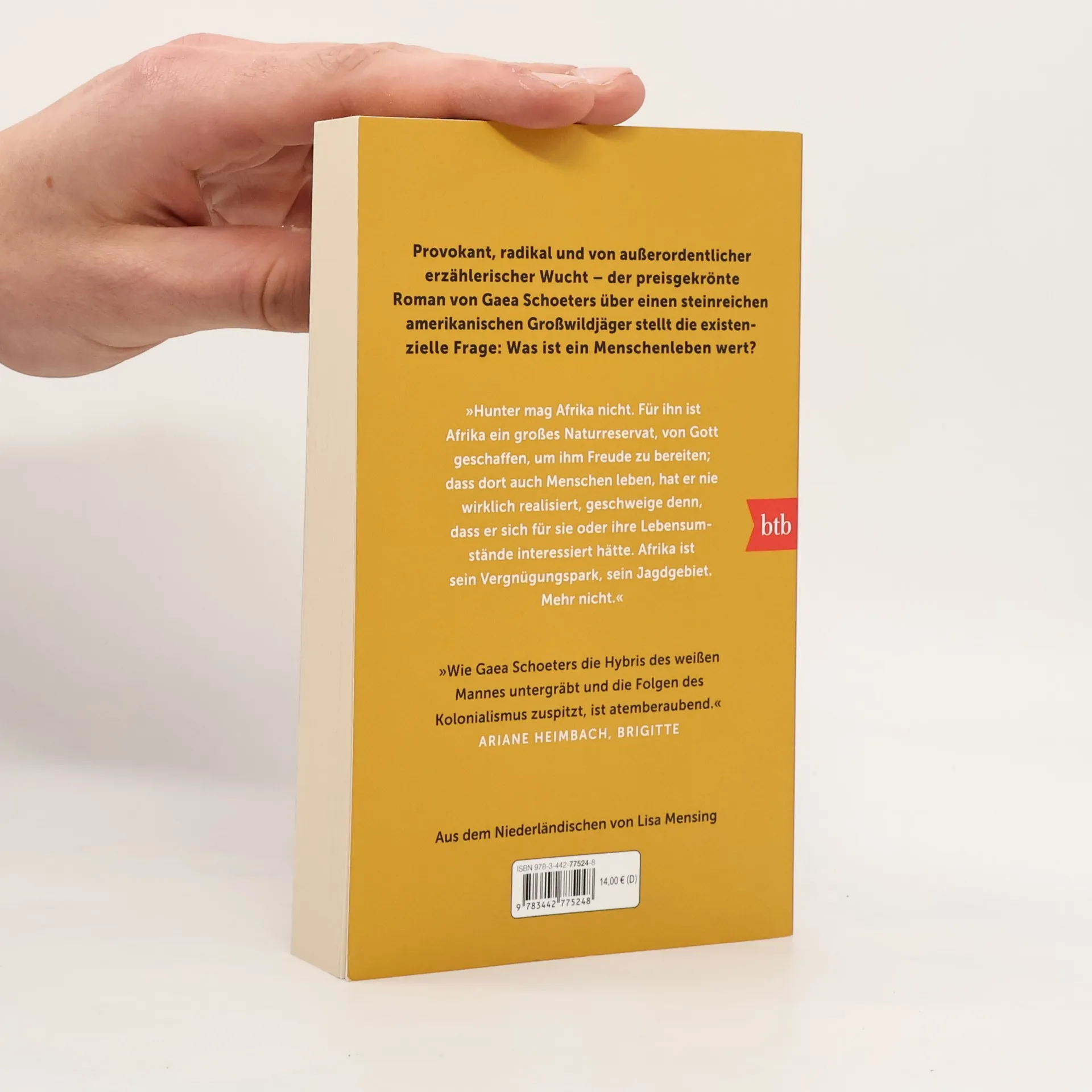 Provokant, absurd und sprachgewaltig stellt »Trophäe« die existenzielle Frage: Was ist ein Menschenleben wert? Hunter White, steinreich, Amerikaner und begeisterter Jäger, hatte schon fast alles vor dem Lauf. Endlich bietet ihm sein Freund Van Heeren ein Nashorn zum Abschuss an und damit die Chance, die »Big Five« vollzumachen. Hunter reist nach Afrika, doch dort wird sein Vorhaben jäh von Wilderern durchkreuzt. Er sinnt auf Rache, als ihn Van Heeren fragt, ob er schon einmal von den »Big Six« gehört habe. Ersatzweise könne er ihm eine andere Trophäe zum Abschuss anbieten ... Gaea Schoetersʼ preisgekrönter Roman ist von einer außerordentlichen erzählerischen Wucht. Die Tiefenschärfe, mit der sie die Geräusche und Gerüche der Natur beschreibt, lässt einen sinnlich erleben, was einen moralisch an die Grenzen zwischen Richtig und Falsch führt.