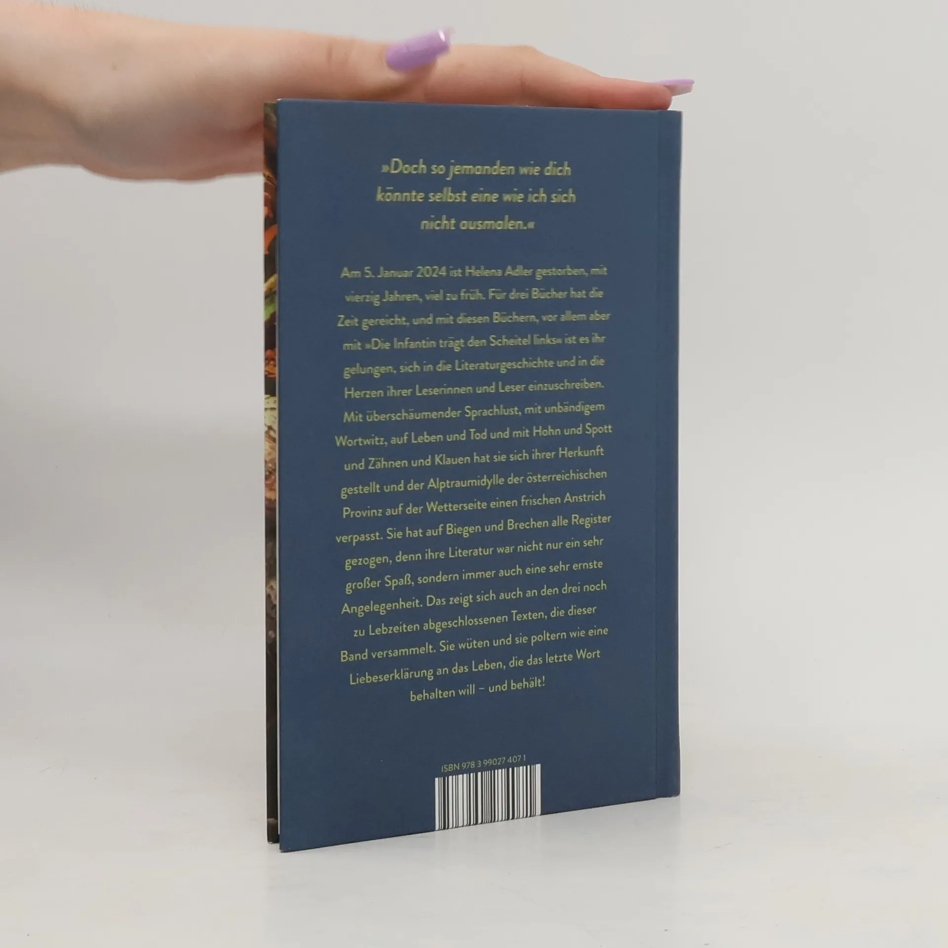 Am 5. Januar 2024 ist Helena Adler gestorben, mit vierzig Jahren, viel zu früh. Für drei Bücher hat die Zeit gereicht, und mit diesen Büchern, vor allem aber mit »Die Infantin trägt den Scheitel links« ist es ihr gelungen, sich in die Geschichte der neueren deutschsprachigen Literatur einzuschreiben. Mit überschäumender Sprachlust, mit unbändigem Wortwitz, auf Leben und Tod und mit Hohn und Spott und Zähnen und Klauen hat sie sich ihrer Herkunft gestellt und der Alptraumidylle der österreichischen Provinz auf der Wetterseite einen frischen Anstrich verpasst. Sie hat auf Biegen und Brechen alle Register gezogen, denn ihre Literatur war nicht nur ein sehr großer Spaß, sondern immer auch eine sehr ernste Angelegenheit. Das zeigt sich auch an den drei noch zu Lebzeiten abgeschlossenen Texten, die dieser Band versammelt. Sie wüten und sie poltern wie eine Liebeserklärung an das Leben, die das letzte Wort behalten will – und behält!