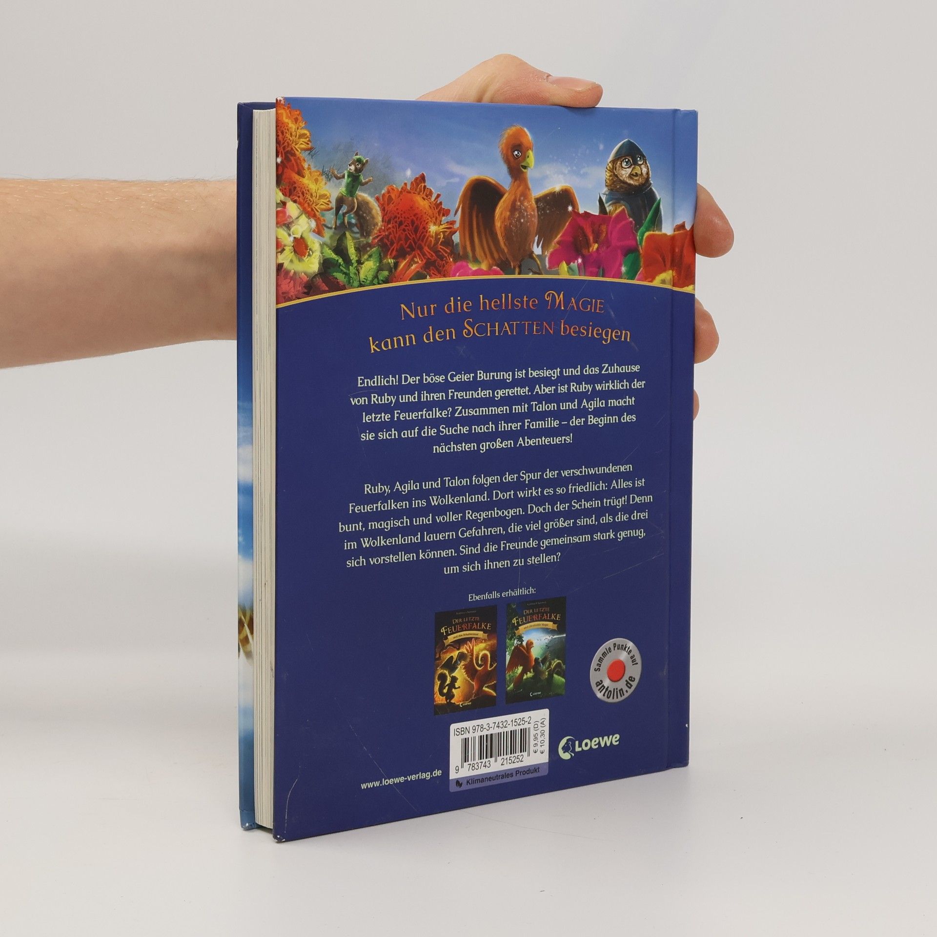 Nur die hellste Magie kann den Schatten besiegen Endlich! Der böse Geier Burung ist besiegt und das Zuhause von Ruby und ihren Freunden gerettet. Aber ist sie wirklich der letzte Feuerfalke? Zusammen mit Talon und Agila macht sie sich auf die Suche nach ihrer Familie – der Beginn des nächsten großen Abenteuers! Begleite den Feuerfalken auf seinem nächsten Abenteuer! Ruby, Agila und Talon folgen der Spur der Spur der verschwundenen Feuerfalken ins Wolkenland. Dort wirkt alles so friedlich: bunt, magisch und voller Regenbogen. Doch der Schein trügt! Denn im Wolkenland lauern Gefahren, die viel größer sind, als die drei sich vorstellen können. Sind die Freunde gemeinsam stark genug, um sich ihnen zu stellen? Die erfolgreiche Fantasyreihe geht weiter Actionreiche Tierfantasy Spannendes Abenteuer für Jungs und Mädchen ab 7 Jahren Geeignet zum Vorlesen und ersten Selberlesen Mit tollen Illustrationen auf jeder Seite Episch wie Tolkiens Hobbit Gut gegen Böse Kurze Kapitel Beliebte Tiere: Eulen Hochwertiges Hardcover Quizfragen auf Antolin
