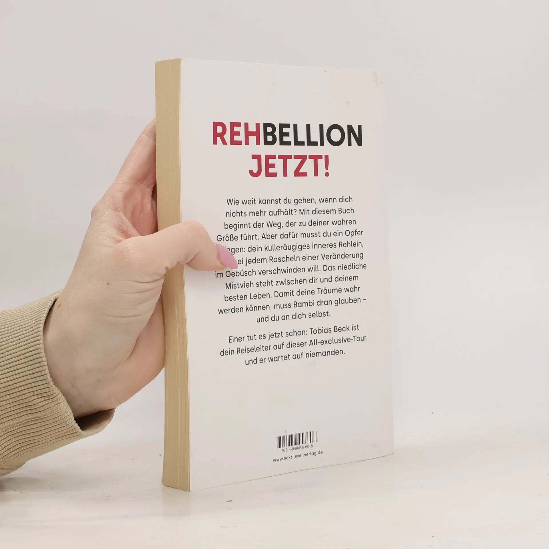 Rehbellion jetzt! Wie weit kannst du gehen, wenn dich nichts mehr aufhält? Mit diesem Buch beginnt der Weg, der zu deiner wahren Größe führt. Aber dafür musst du ein Opfer bringen: dein kulleräugiges inneres Rehlein, das bei jedem Rascheln einer Veränderung im Gebüsch verschwinden will. Das niedliche Mistvieh steht zwischen dir und deinem besten Leben. Damit deine Träume wahr werden können, muss Bambi dran glauben – und du an dich selbst. Einer tut es jetzt schon: Tobias Beck ist dein Reiseleiter auf dieser all exclusive-Tour, und er wartet auf niemanden.
