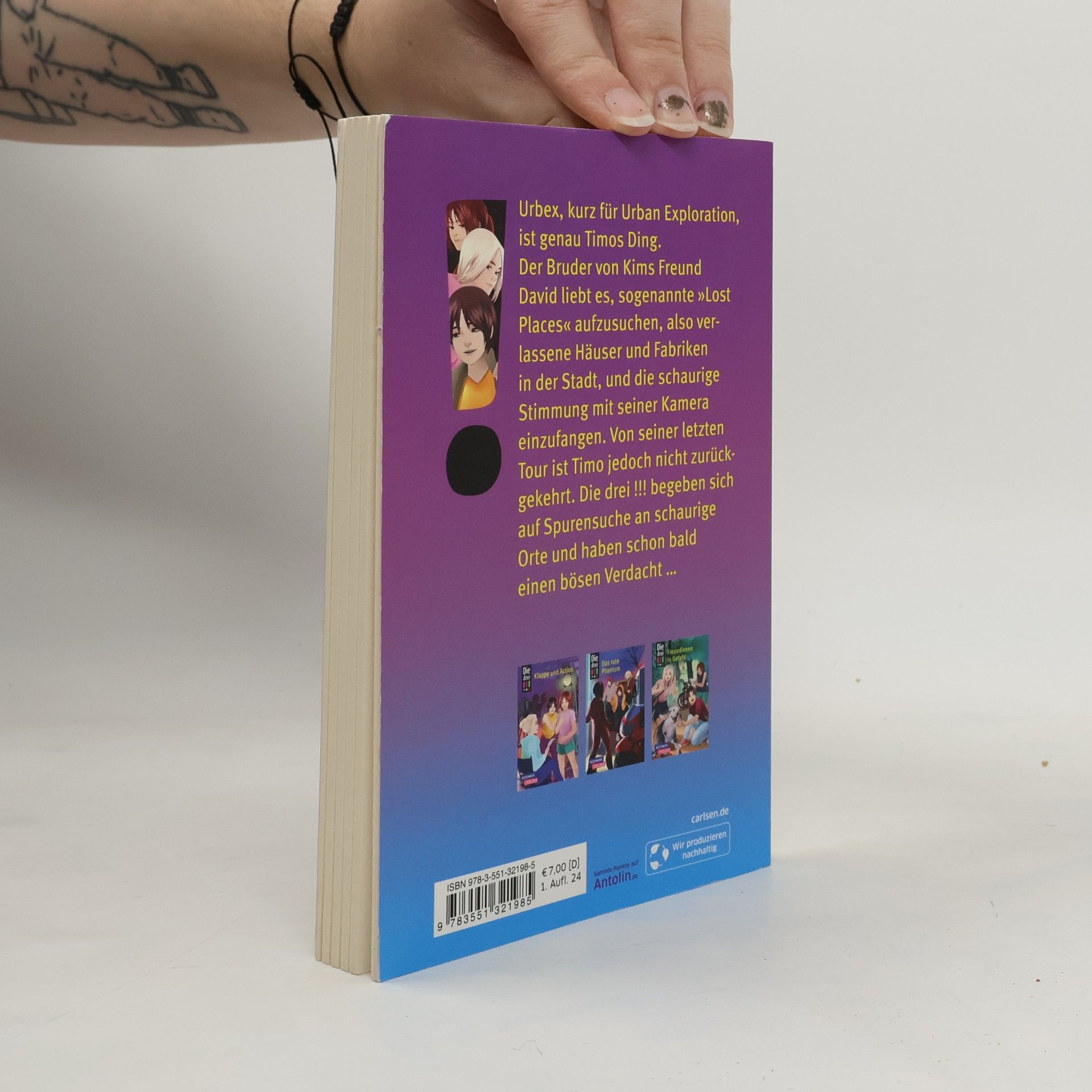 Ein unlösbarer Fall? Nicht für die drei !!! UrbEx? Kim versteht gar nichts mehr. Timo, der Bruder ihres Freundes David, ist von einer seiner UrbEx-Touren nicht zurückgekehrt. Urban Exploration heißt das Hobby, bei dem man verlassene Häuser und Fabriken besucht, um die Stimmung auf Fotos einzufangen. Die drei !!! folgen Timos Spuren und tauchen ein in die unheimliche Welt der »Lost Places«. Schon bald kommt ihnen ein schlimmer Verdacht ...