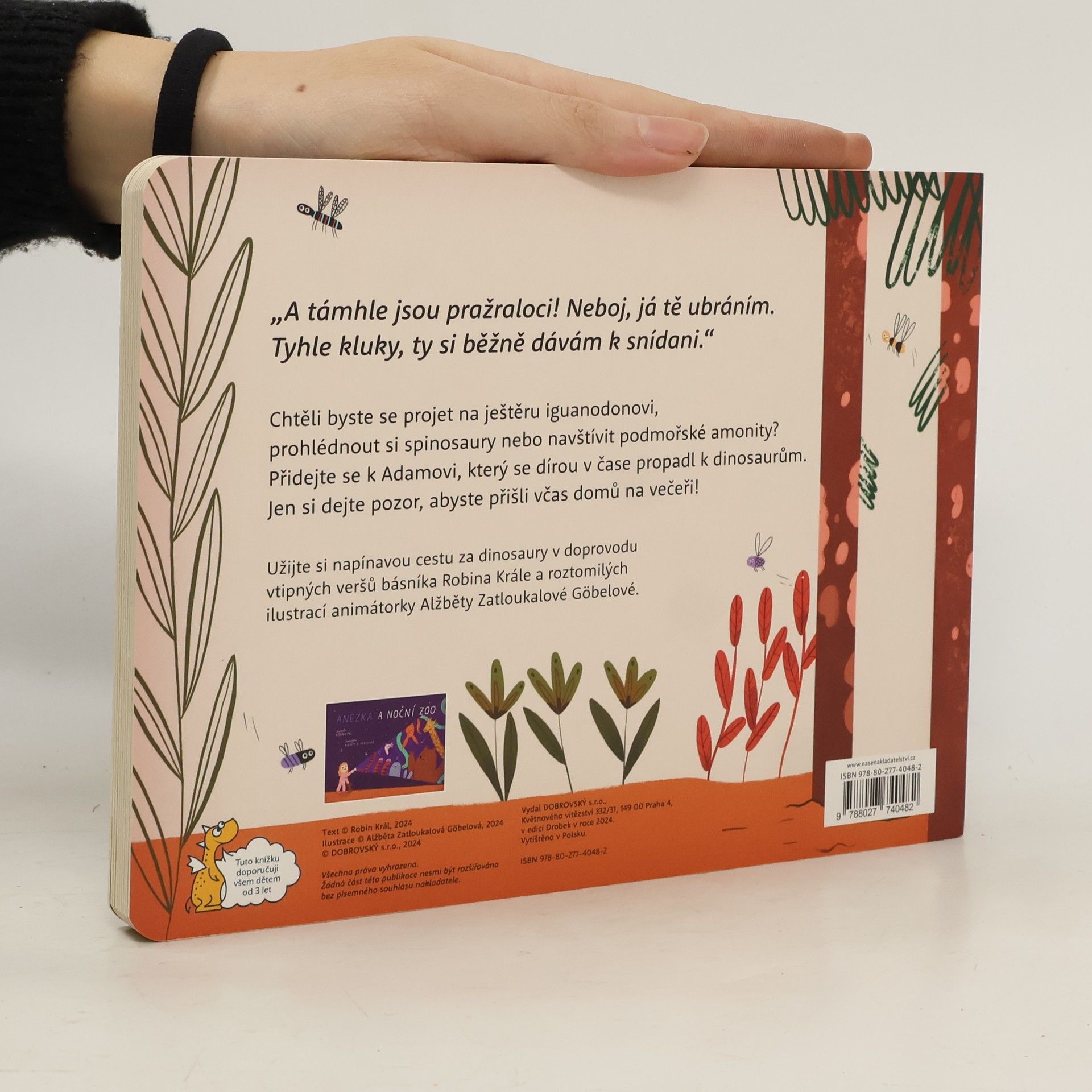 „A támhle jsou pražraloci! Neboj, já tě ubráním. Tyhle kluky, ty si běžně dávám k snídani.“ Chtěli byste zažít jízdu na ještěru Iguanodonovi, útěk před Spinosaury nebo návštěvu u podmořských amonitů? Tak se pojďte spolu s Adamem propadnout dírou v čase mezi dinosaury. Dejte ale pozor, ať nezapomenete přijít včas domů na večeři. Užijte si s dětmi společné čtení veršů Robina Krále, autora poezie pro děti, jehož Vynálezárium získalo ocenění Zlatá stuha i Magnesia Litera a leporelo Bydlíme hned vedle zoo a veršovaná kniha Jeden kluk z vesničky Květušín jsou na seznamu Nejlepší knihy dětem za školní rok 2022/2023. Knihu ilustrovala animátorka, scenáristka a režisérka Alžběta Zatloukalová Göbelová, která je jako ilustrátorka podepsaná např. pod knihou Tasemnice hledá byt, jež se také dostala na seznam Nejlepší knihy dětem.